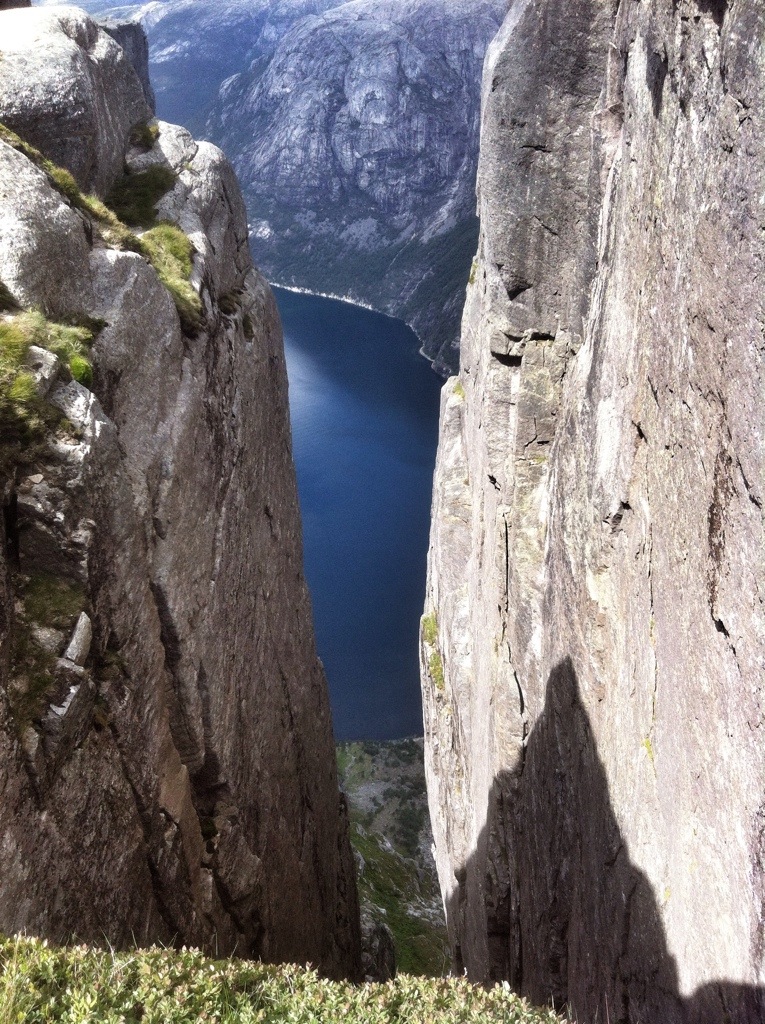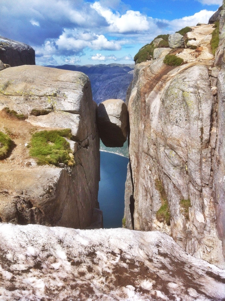 The boulder was lodged between two sheer rock walls and below the rock was a 1000m drop down, much to my dismay it dropped to land, not water, so I was guaranteed death if I fell. There was a large flat rock to the left of the boulder where everyone sat and ate their lunch. The walls dropped down from the edges and looked out over the beautiful blue water of Lysefjord, and higher sheer walls were on either side of us.