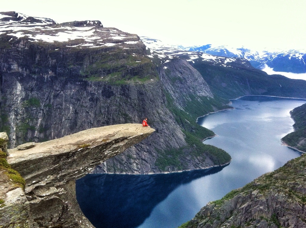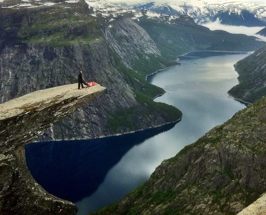 We had a few more streams, and gushing waterfalls to negotiate and rock hop over and 4 hours later we’d made it to Trolltunga. A long sheet of rock hovering above the void below. It hung over foliage and rocks, but the lake we’d been following was an amazing backdrop for it.