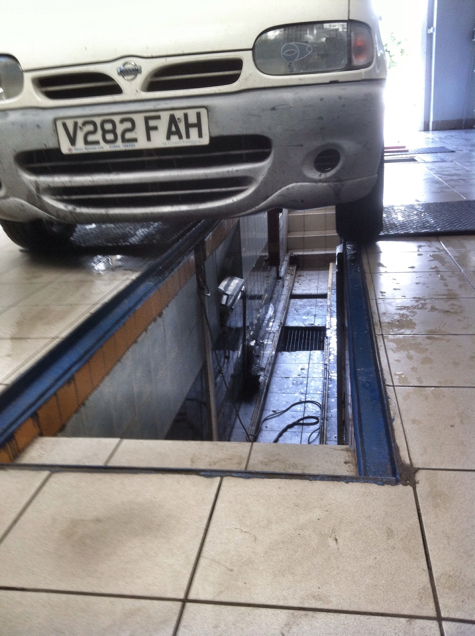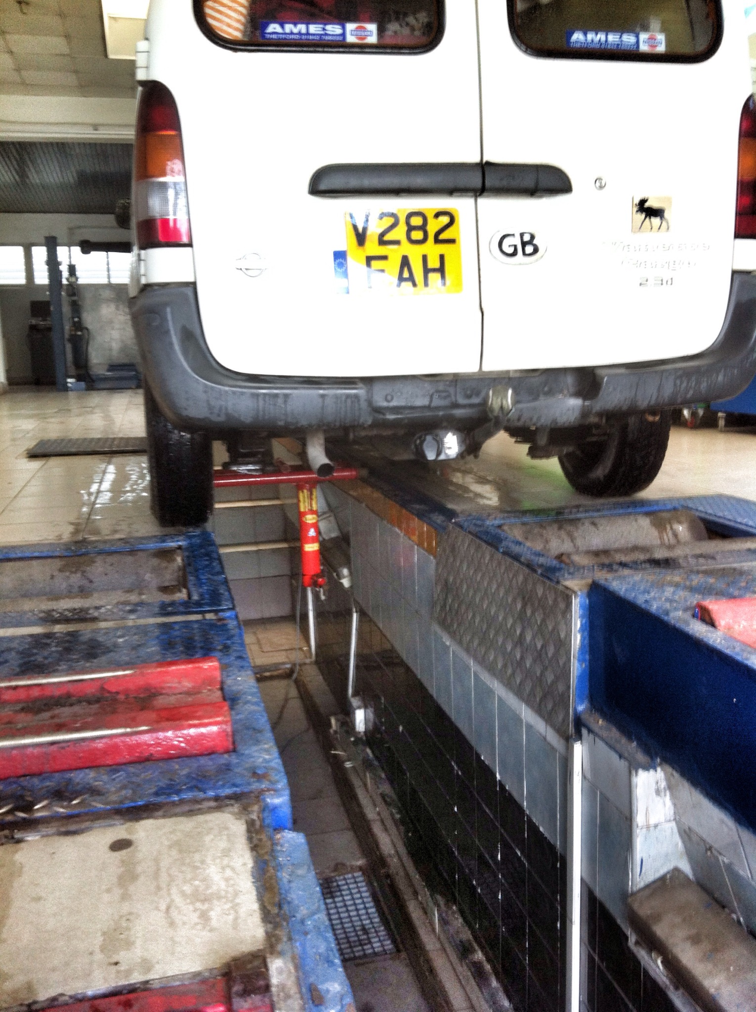 We walked in, to see Pablo’s left side practically clinging onto the edge of a 2m drop. The garage had a 1m wide gap by 2m deep with steps down either end so you can walk under a the vehicle. If he drove a couple more inches forward, Pablo would of crashed down and probably been a right off. I don’t know whether it was because the mechanic was driving a right hand drive but WHAT THE FUCK, how can you be so far off??