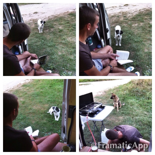 Romania has a lot of stray dogs, and soon enough we saw a feral looking one come down the road towards us. Luckily he headed the other way. Craig was sat reading his book on the van floor and then he said ‘the dogs here Lauren!’. It had silently snuck up and stood staring at us, I made a little scowl noise which made him jump back a bit. I felt bad, he was pretty cute and harmless so we let him hangout with us. Then he thought it would be funny to sit in front of us and get out his goddam lipstick! This is why I will never get a male dog. Put me right off my dinner.