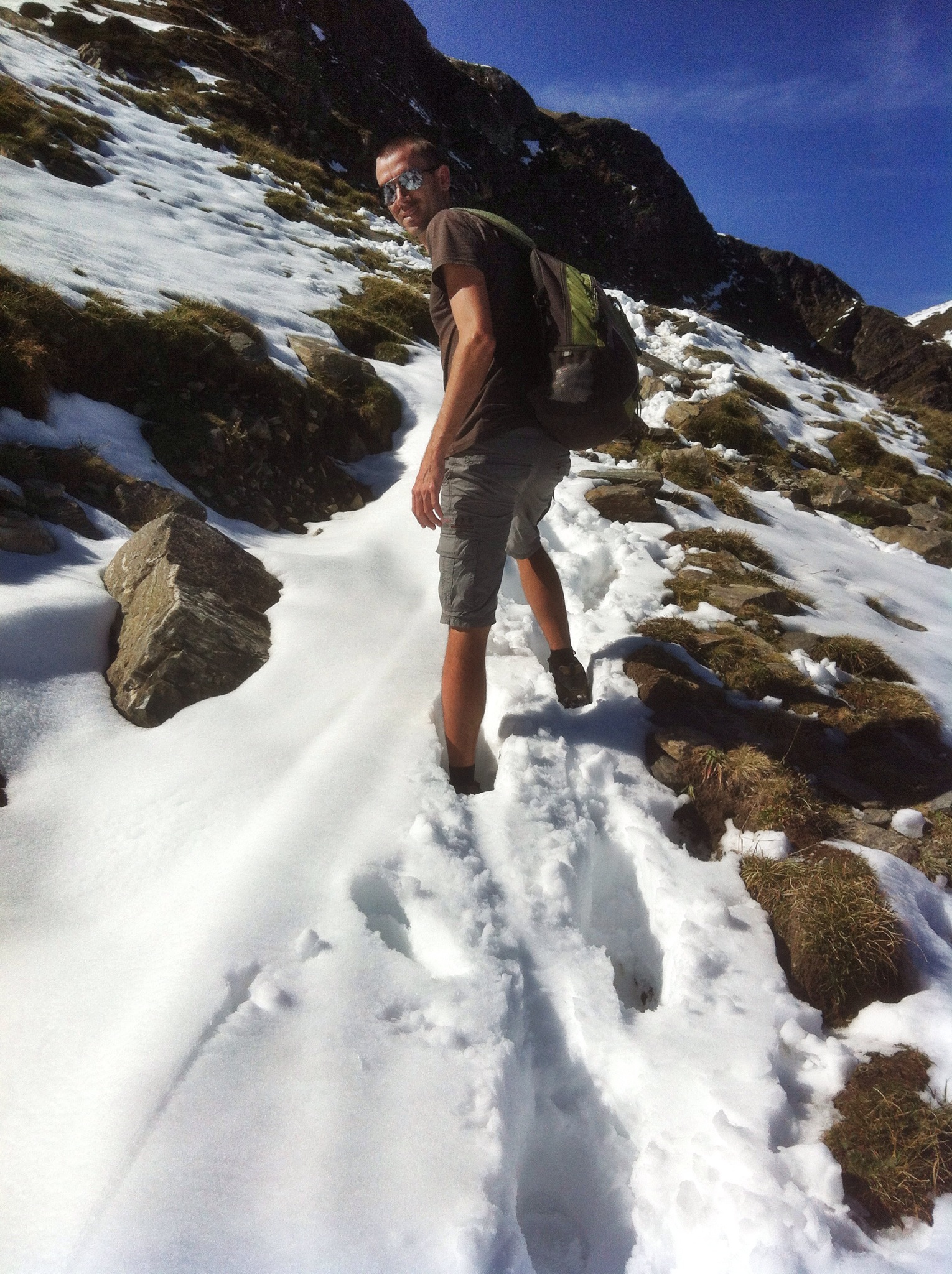 We had a very slippery walk back down through the snow and veered off to walk a different route past other lakes. On the way a man walked towards us, barefoot and topless. He had long, greasy blonde hair and reminded me of Handsome from Scary Movie. He asked us what the conditions were like where we’d come from. Snowy, icy…probably worth avoiding if you have no goddam shoes! What the hell?
