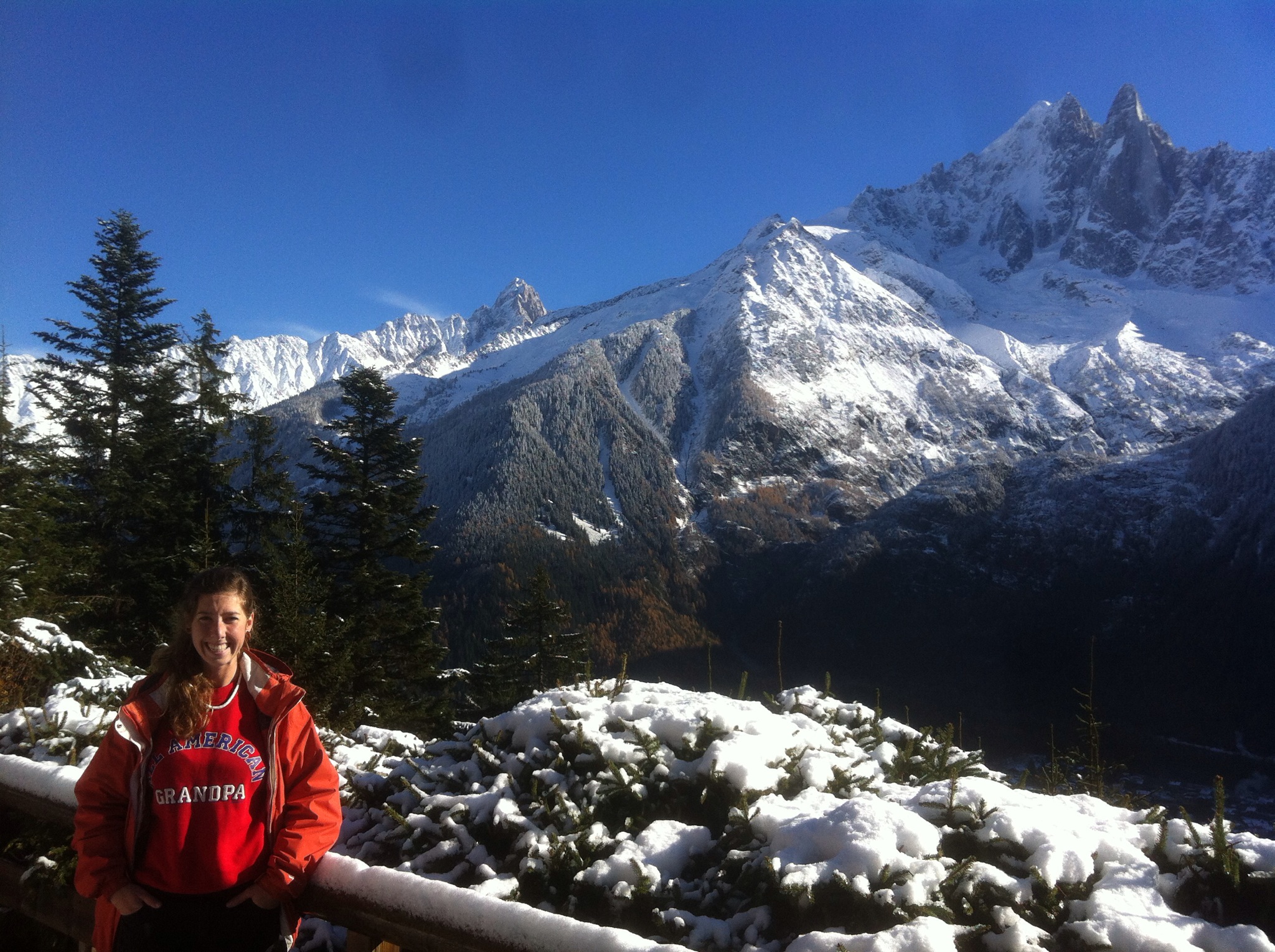 We had another freezing cold night and were frozen inside Pablo again. The skies were crisp and clear so we walked through town to a sign labelling all the mountains along the Mont Blanc Massif. We were surprised to see Mont Blanc was just a boring white lump compared to its dramatic neighbours. Huge glaciers swept down the mountains like blue lava. One photo in the info centre showed the nearby church in the 1800’s, the glacier was practically touching it, now it’s receded 1.8km back.