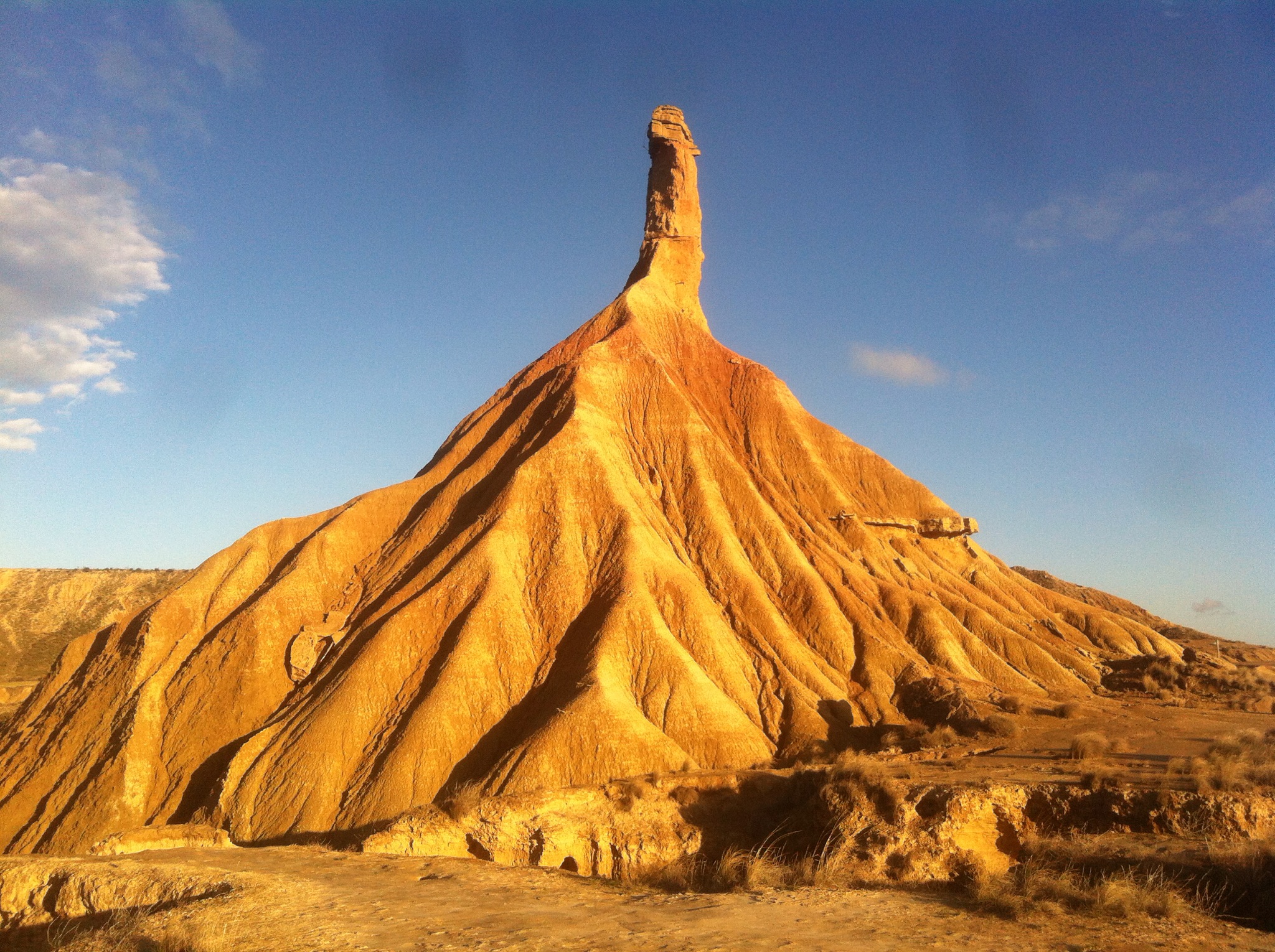 Bardenas Reales is an unpopulated area made up of clay and sandstone which over time has been shaped and carved by wind and water. It’s like mother natures pottery class. The main highlight of the park is a lone rock formation that’s shape is hard to describe; like a pyramid with a candle poked into the top and the wax has all dripped down giving it an unusual shape and texture. The sun was at the perfect height to make the surroundings glow a beautiful burnt orange colour. We walked around the rock formation which had gullies and creases along its edges, like the wrinkled face of an old lady. The top spire had rocks balanced on top which were so neat and square shaped that they looked like the remains of a man-made wall, as appose to a layer of natural deposits.