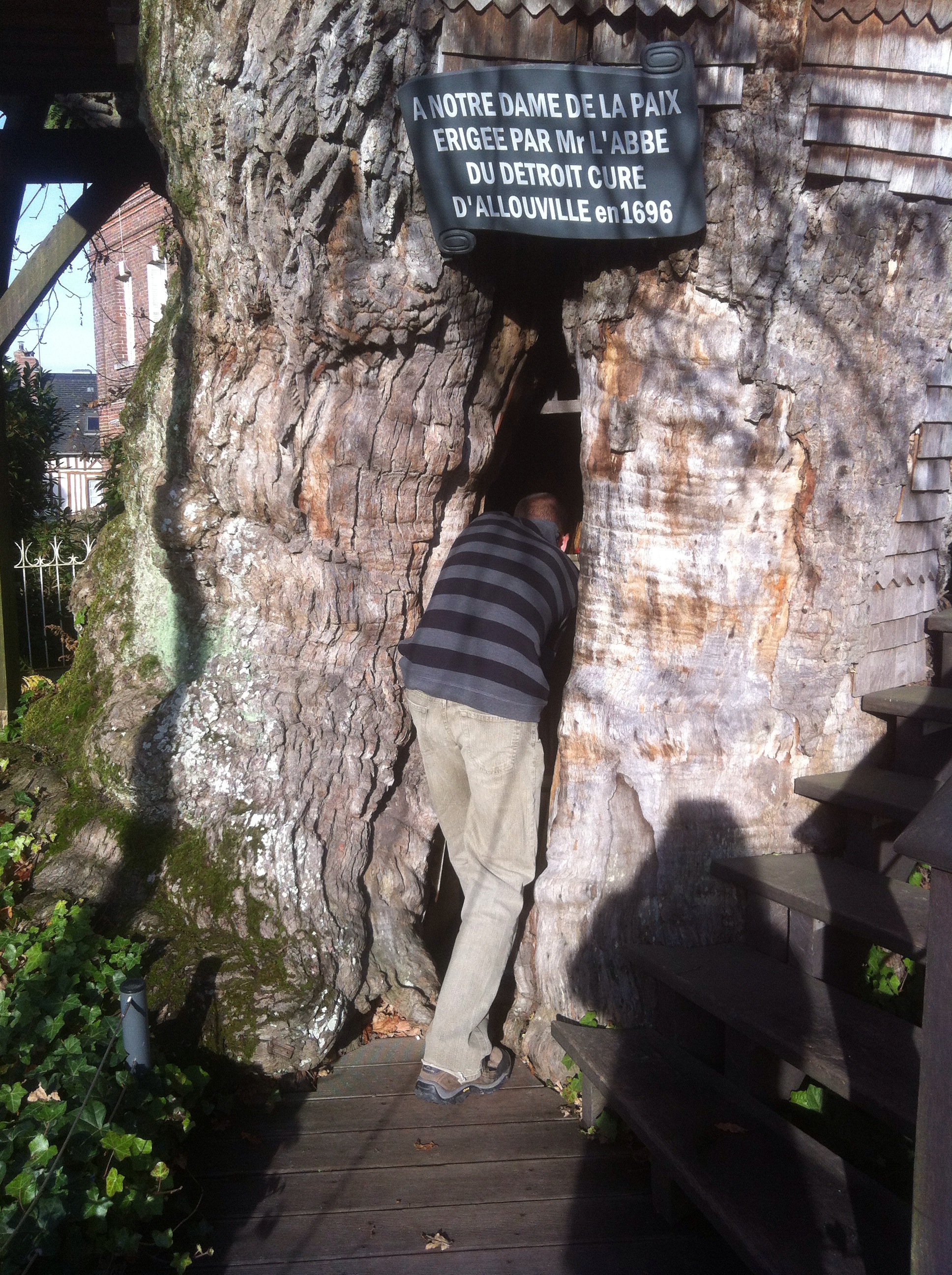 To end our last day in France we headed to Allouville-Bellefosse, a tiny village which was home to a church…which was built within a tree! It was like a scene from a Tim Burton movie. The oak tree had been electrocuted by lighting and left hollow, in the 17th century the locals decided to build two chapels inside it. They also built a spiral staircase leading around the outside. It was amazing, all covered in tiny wooden tiles, branches poking in all angles and ropes and rods holding it all in place. We entered the lower chapel by squeezing through a natural crack in the tree, inside was roughly the size of a small wardrobe.