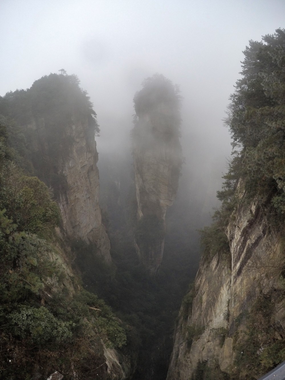 We had two options now – literally a day full of decision making which I hate. We could walk back down those dreaded steps or get the Bai Long elevator down and walk along the river. Either way we were cutting it fine to actually get back in time for the last bus. We went for the elevator – it’s the highest outdoor lift in the world and cramped about a dozen people in the glass box. It also cost about £8, can’t believe we just paid for a bloody lift. We were right opposite a huge pinnacle and followed its length down till we reached the bottom and weaved our way through the crowd to get out. The views round here were amazing and no low-cloud but we didn’t have any time to admire it.