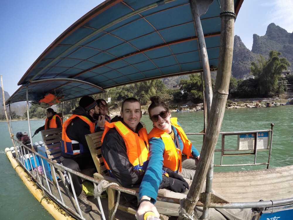 Craigs birthday was falling on a blue sky day so we wanted to take a boat ride along the famous Li River to see the unique pointy mountains that line its banks and spread into the countryside. We had a choice of a large double decked boat with potentially 100 or so other people, or a bamboo raft for 4 people. So we picked the latter.