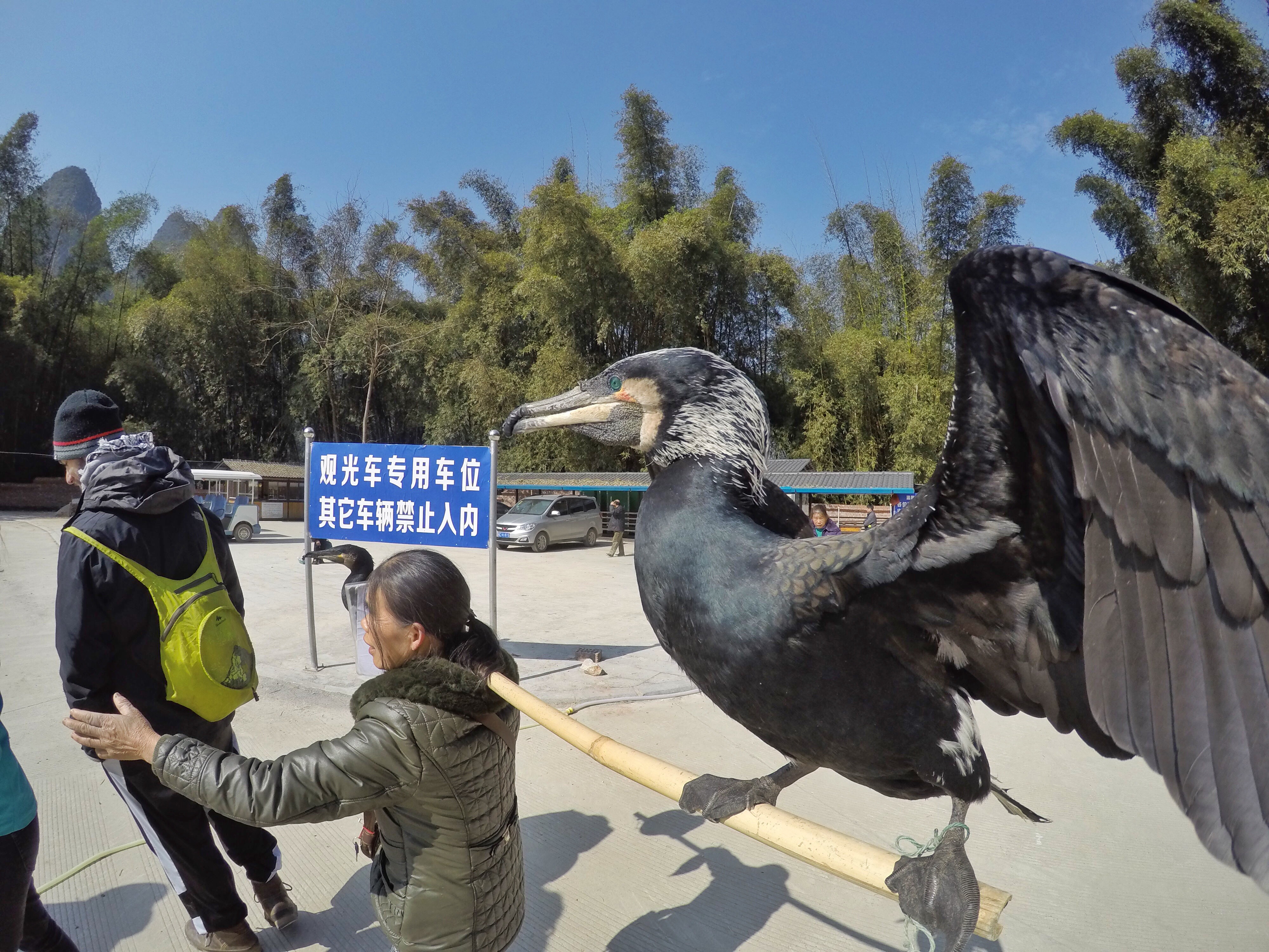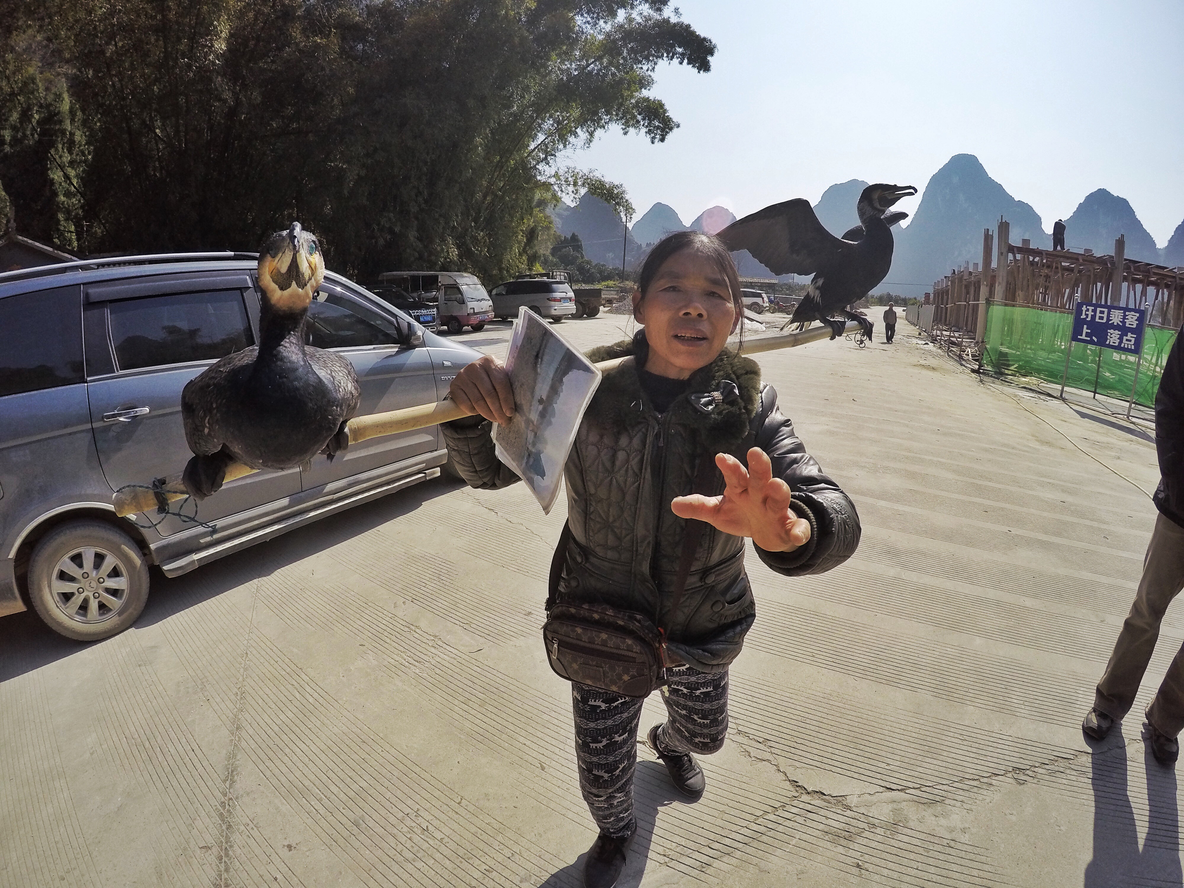 After a few bends the scenery got really impressive and the pyramid like mountains surrounded us. We were dropped of on the shore and reached an opening with golf carts. We were pretty sure somewhere in the Mumbo jumbo of the tour guides speech she said to get on a golf cart but we just stood around chatting to the other westerners for a bit. Then I spotted a lady with two Cormorant birds, one on each end of this stick. This is one thing we really wanted to see at the Li River, the ancient way of fishing with these large birds. But of course this lady was just using the birds for money, she saw me take a sly photo and tried to get me to pose for one of her ‘professional’ photos with the stick balanced on my shoulders. She literally put the stick on me while I was walking and I had the whole weight of the birds on me while chanting ‘Don’t let go! Your gonna hurt your birds!!’. I looked pretty cool as a cormorant fisherman if I don’t say so myself.