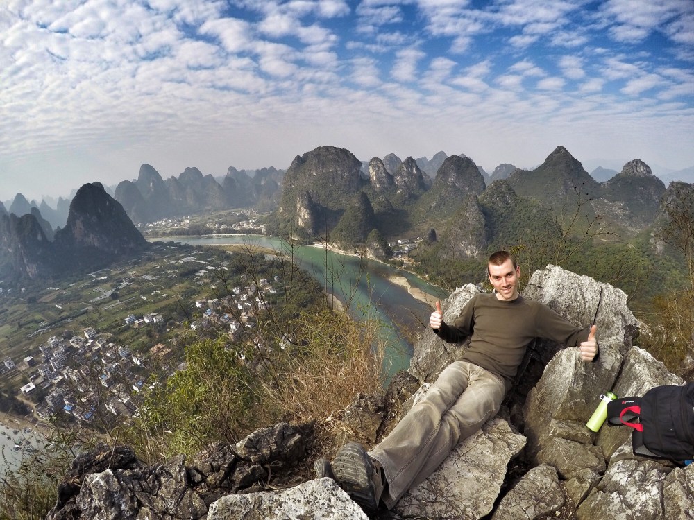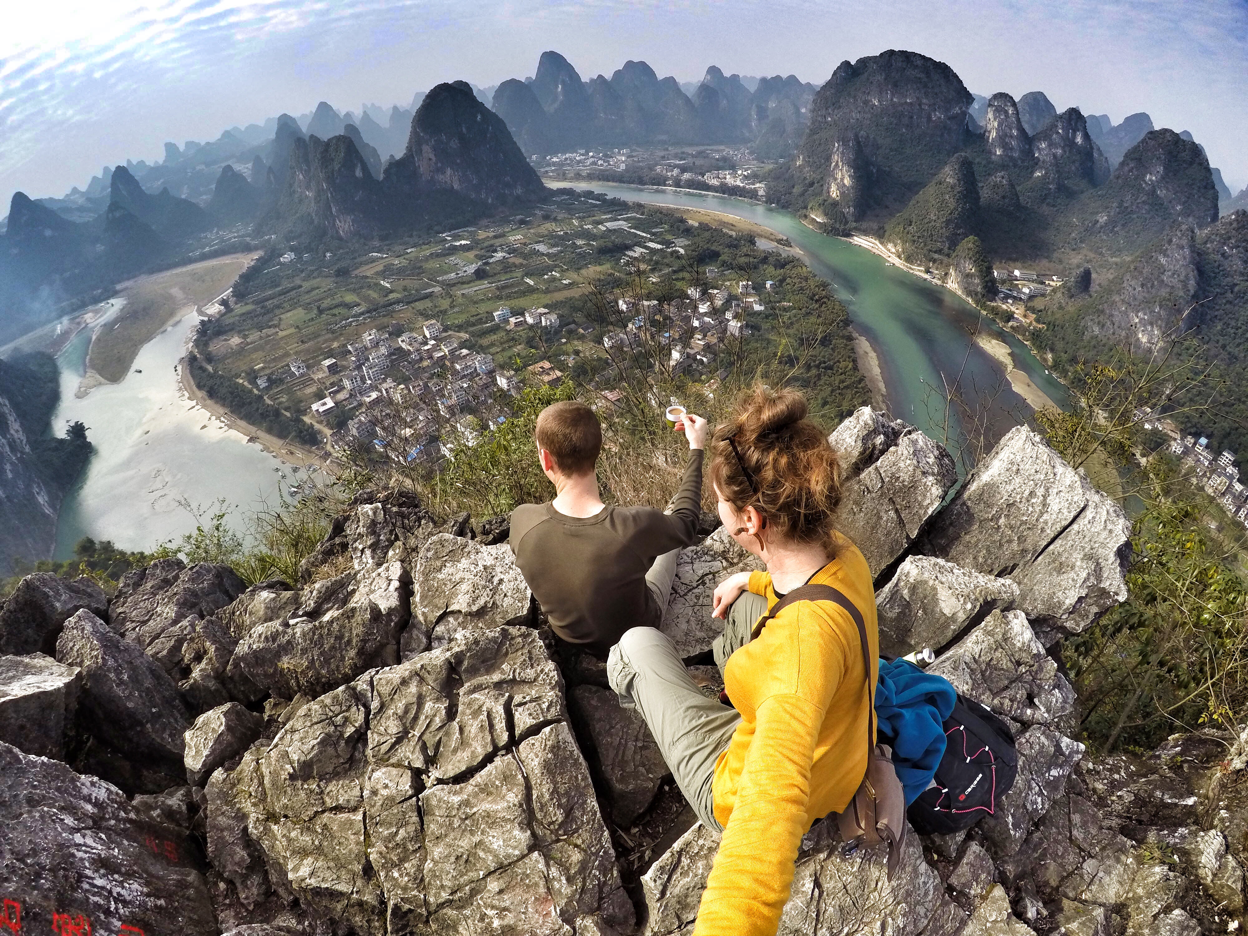 A short hike up a thousand or so steps led us to a viewpoint over the surrounding area. It was awesome, but a little scramble up some rocks led to the best view. The river had a huge bend in it that went right below the mountain we stood on. There was an area of flat farmland with houses built on it and then as far as you could see were mountains shooting up like plants fighting for the sun. It was incredible. We sat on the edge drinking coffee from our flask and taking in the superb view.