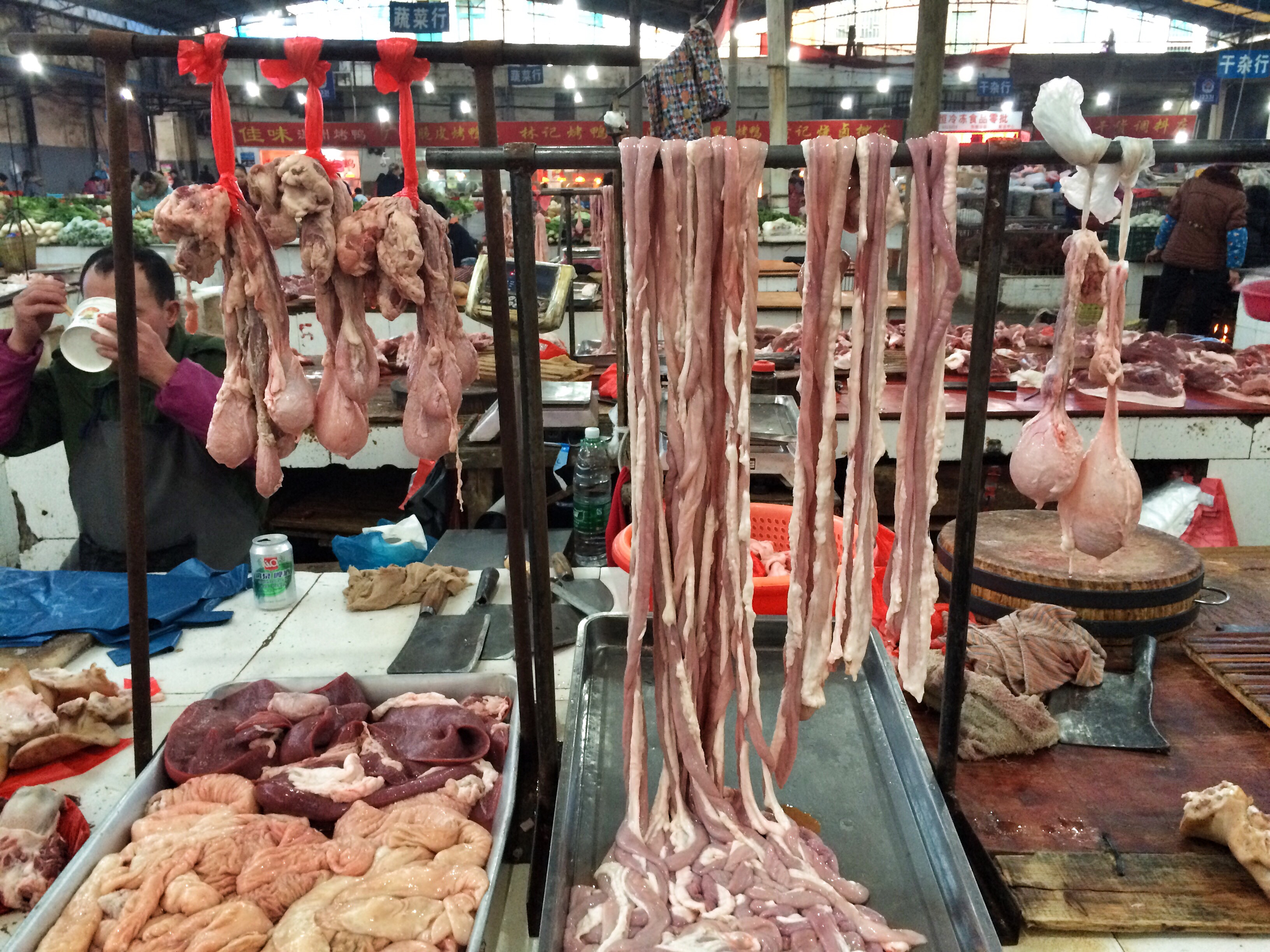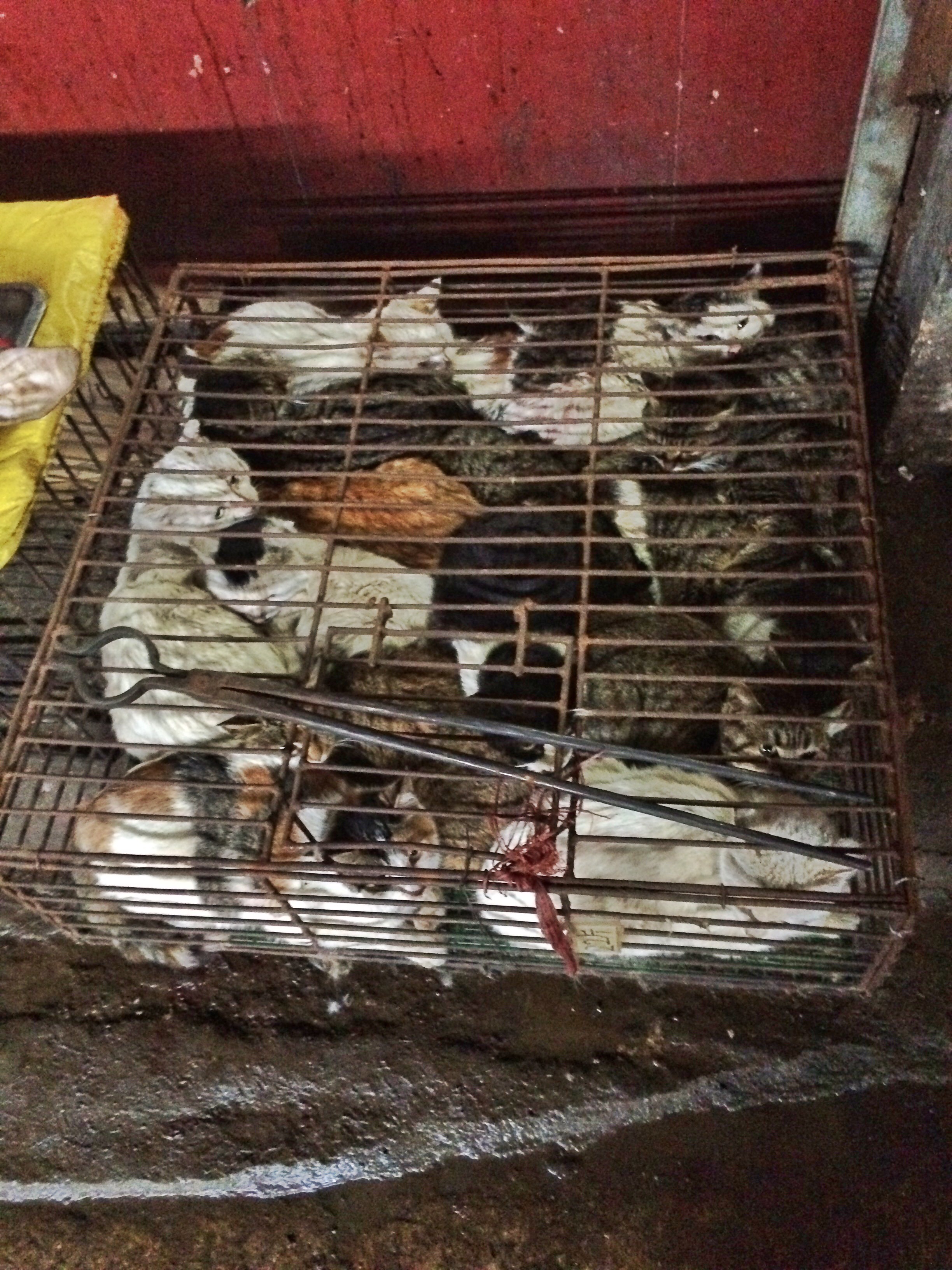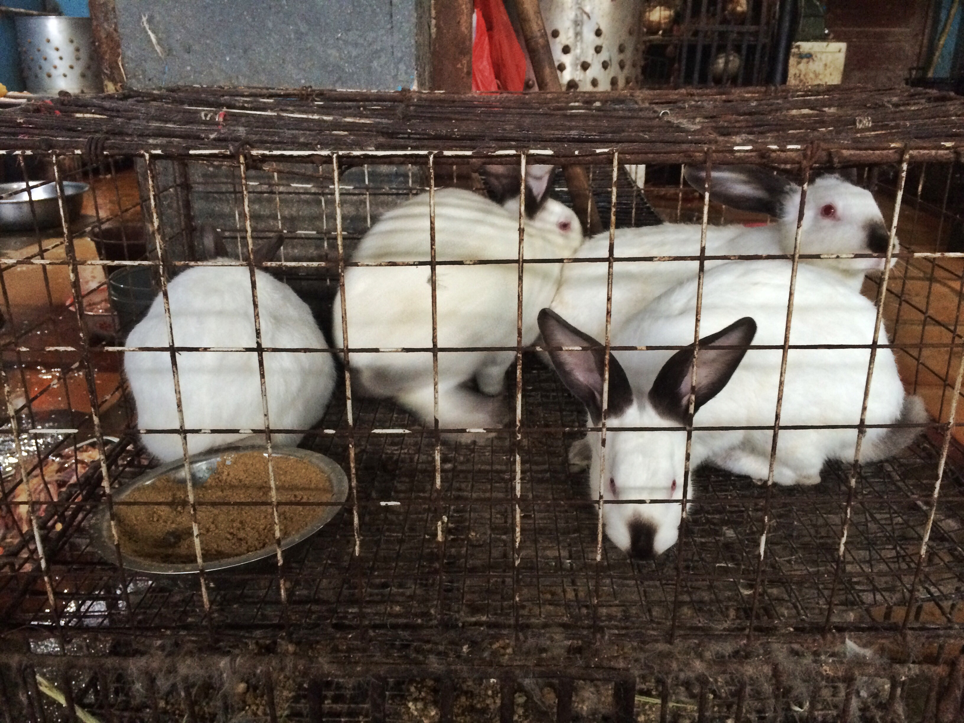 The normal meat market took a turn when we saw cages with gorgeous fluffy white rabbits, and in the back room they were being boiled and skinned. The next stall had a flat cage filled with cats, by flat I mean they couldn’t stand up and by filled I mean they couldn’t move. Their sad little eyes just looked up at us.