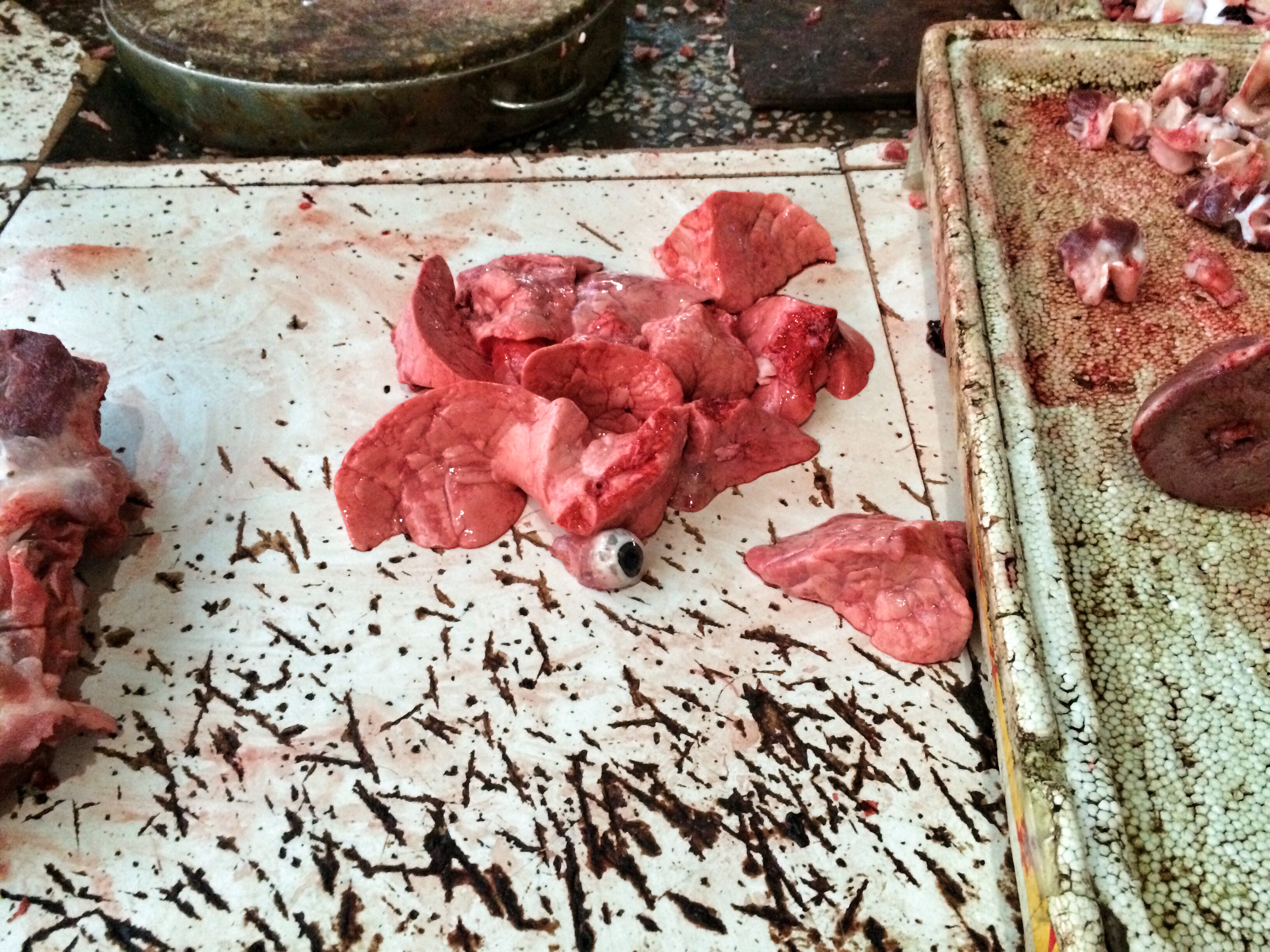 As we walked between hoofs and genitals we saw a freshly killed dog, we think it had just been boiled as it was now fur-less and plonked onto a grill like a limp body saved from drowning. Then the butcher got out a blow torch and moved the flame across the body. Maybe they continue to do that and that’s why they shrink up and looked roasted on the outside, but that was quite enough for us and we headed out for some fresh air.