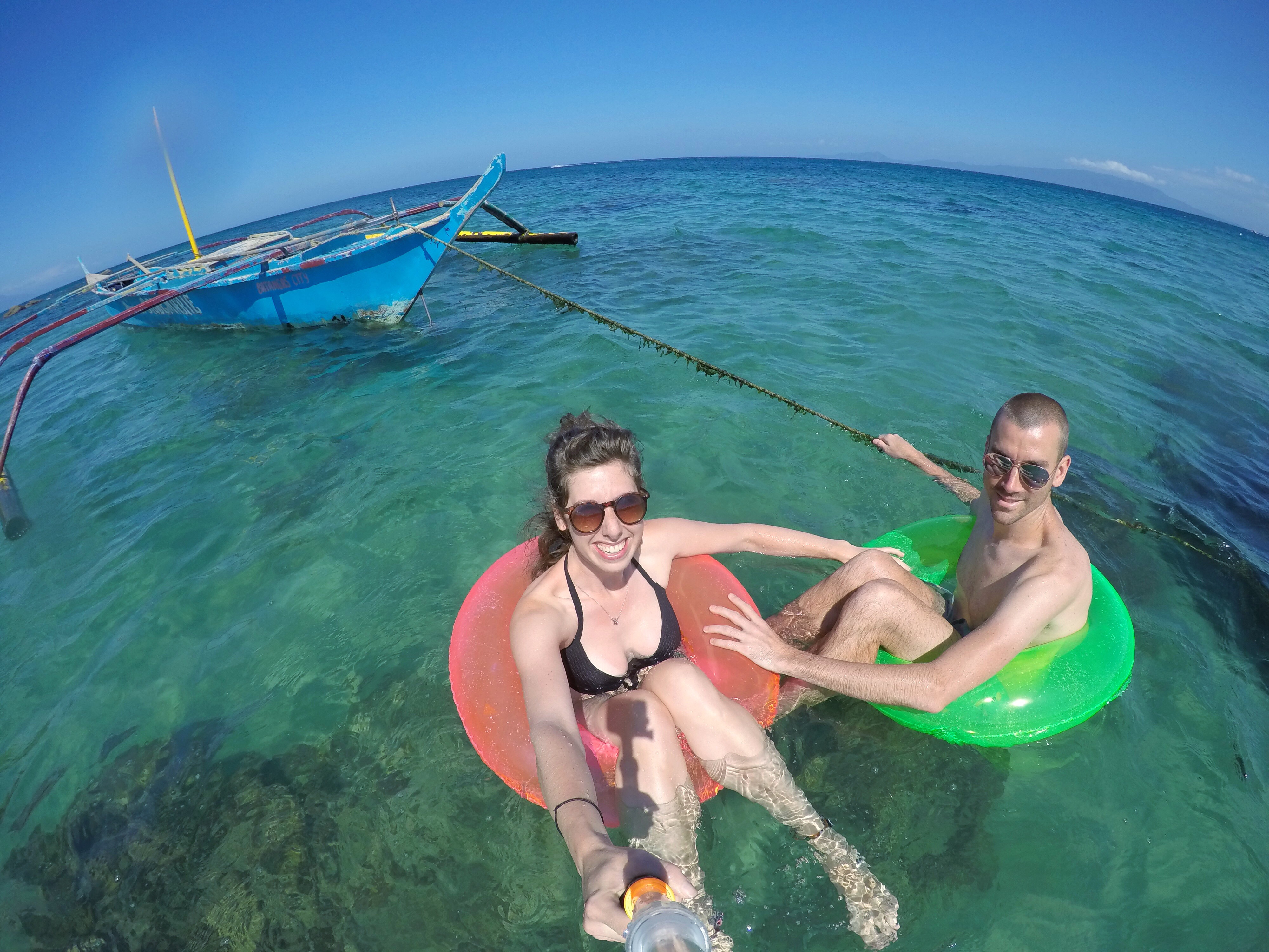 Our first boat across to a tropical island wasn’t exactly the boat we’d expected. Instead of a sizeable ferry it was a brightly painted Bangka, basically a large wooden boat with bamboo stabilisers on each side tied together with fishing line. We were heading across to Puerto Galera on Mindoro Island and were so excited to swim in the sea for the first time in a over a year!