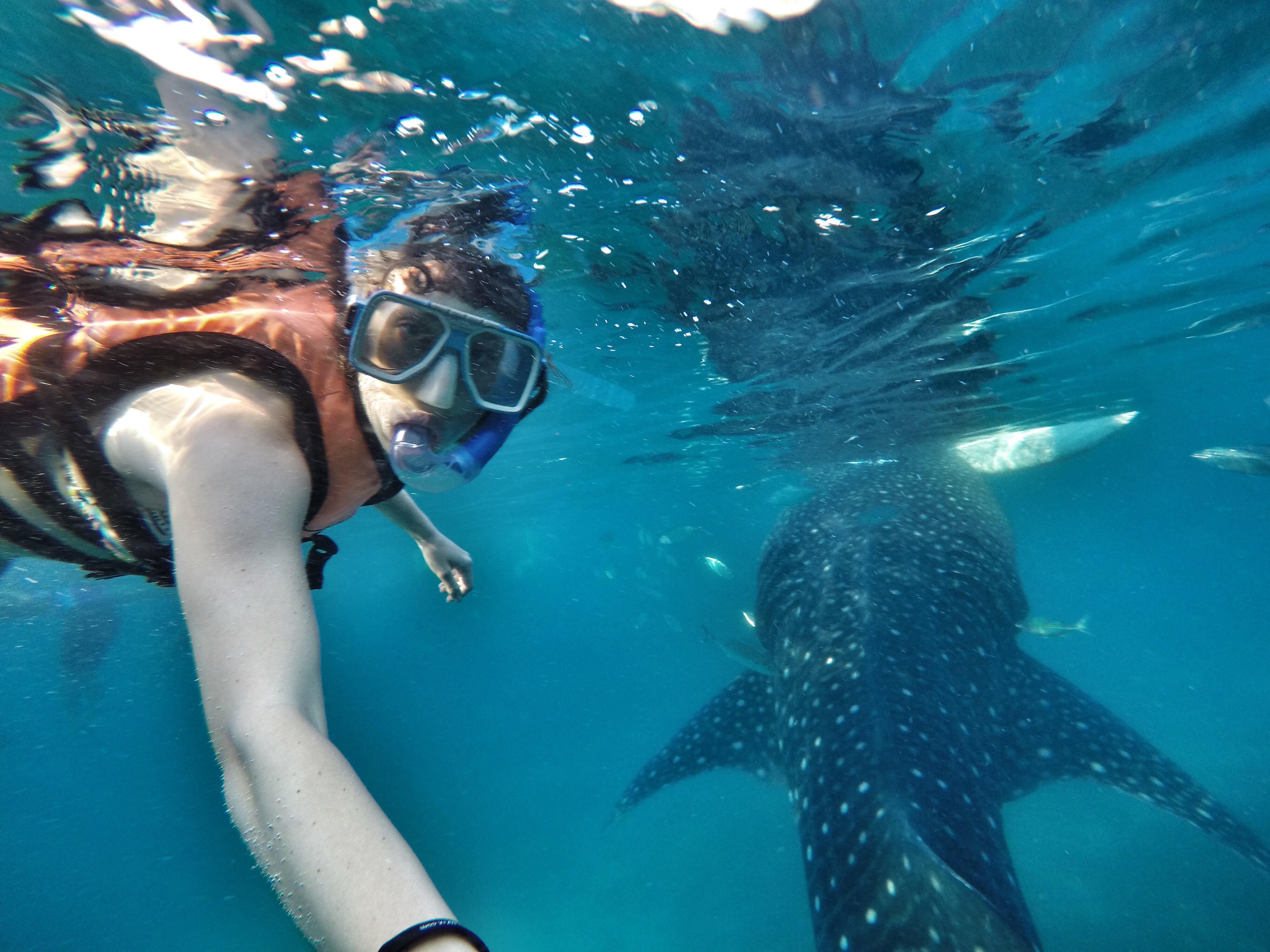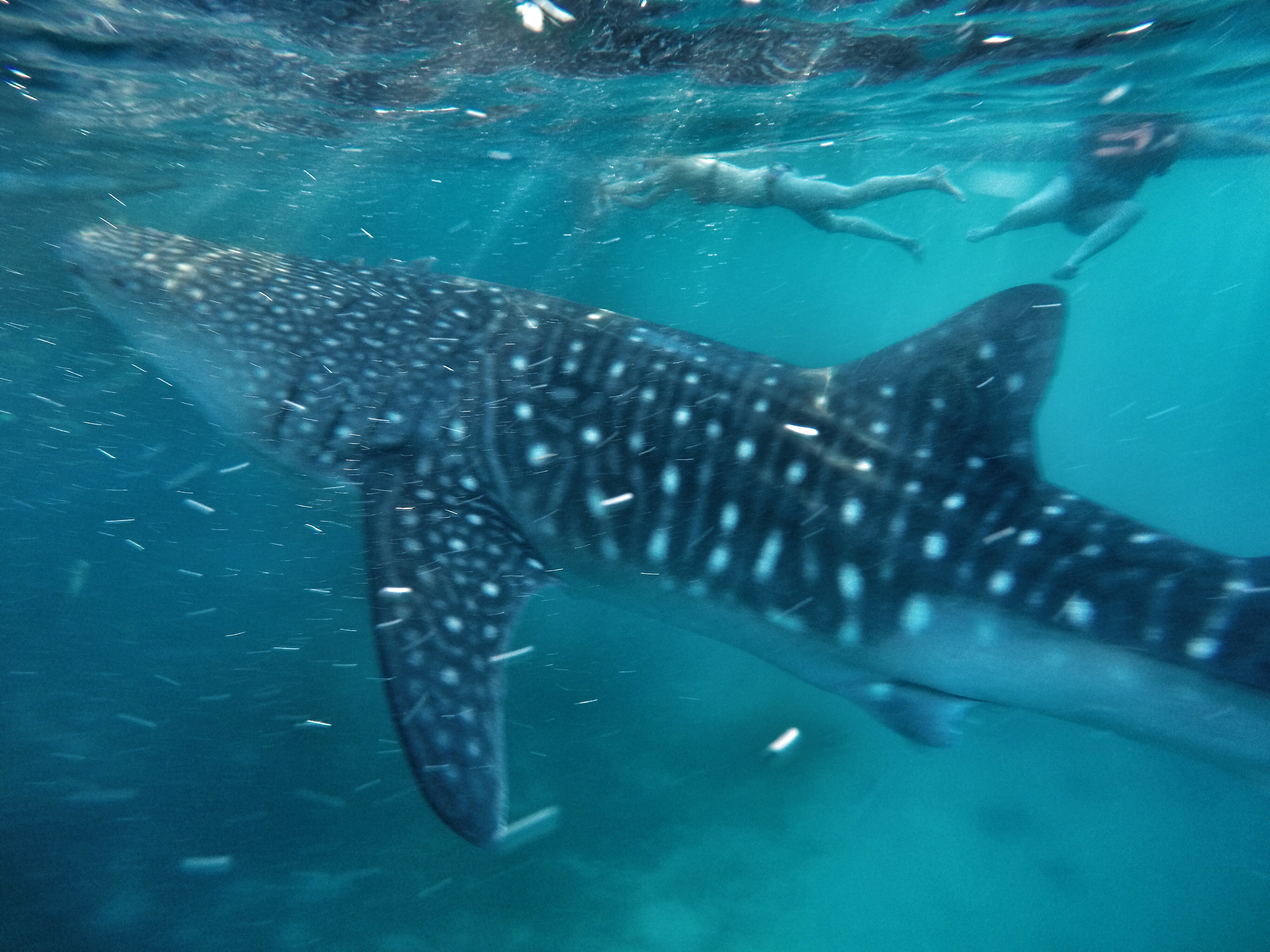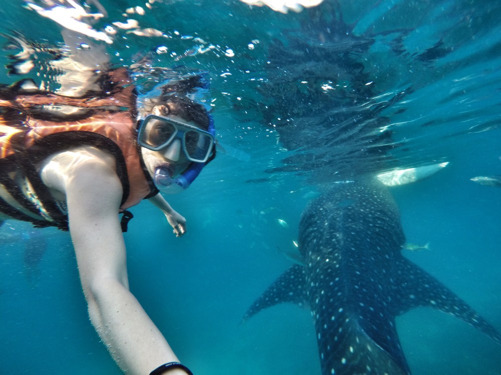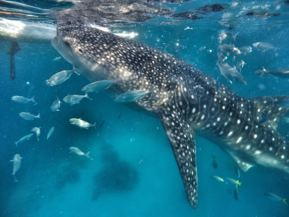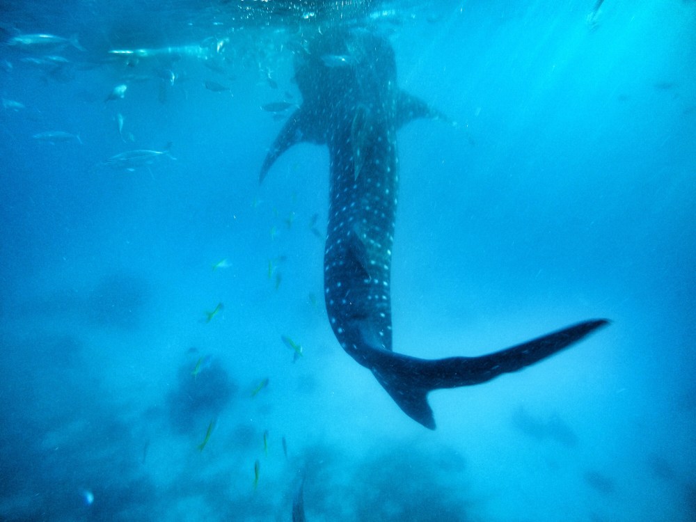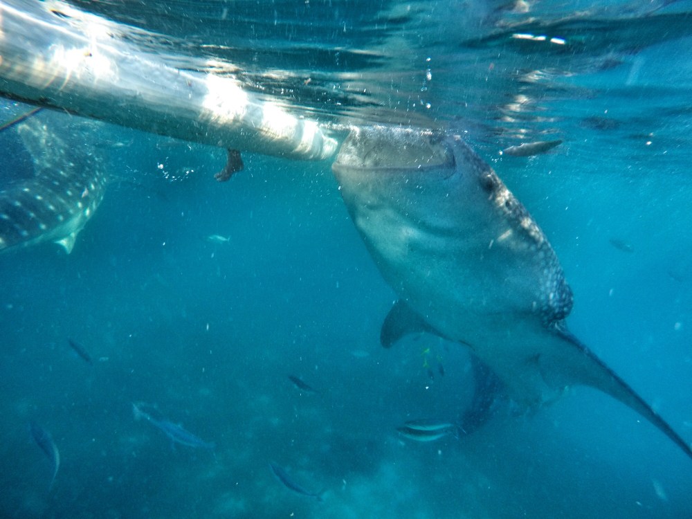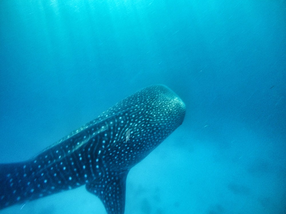 We gently slipped over the edge of the boat and into the dark water. It was quite eery and dark beneath us and I didn’t like it much, but boatmen were soon shouting for us to swim towards them where they were putting food into the water. Within seconds we saw this GIGANTIC whale shark coming our way. It was incredible. He opened his meter wide mouth and gallons of water flowed through and he’d keep the good bits while the water filtered through his massive gills. When their fins raised above the water you could be mistaken for thinking it was a shark.