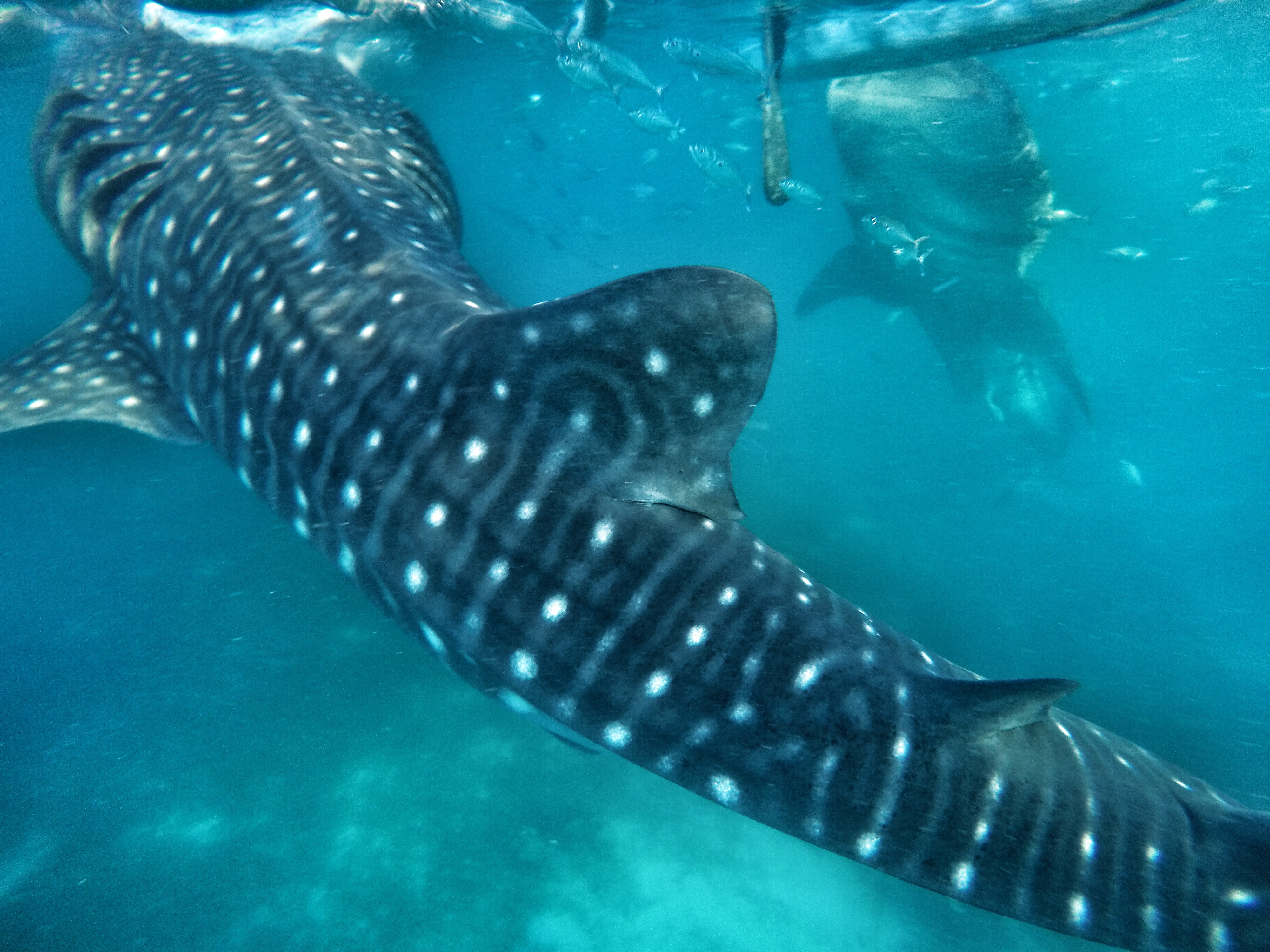 As I quickly did a 360 degree spin I saw 5 whale sharks around us. Some were feeding at the surface, others were swimming alongside us and a more natural looking sight was the sharks gliding below us. There were shawls of fish all around too, a lot of them were basking fish with their mouths wide open.