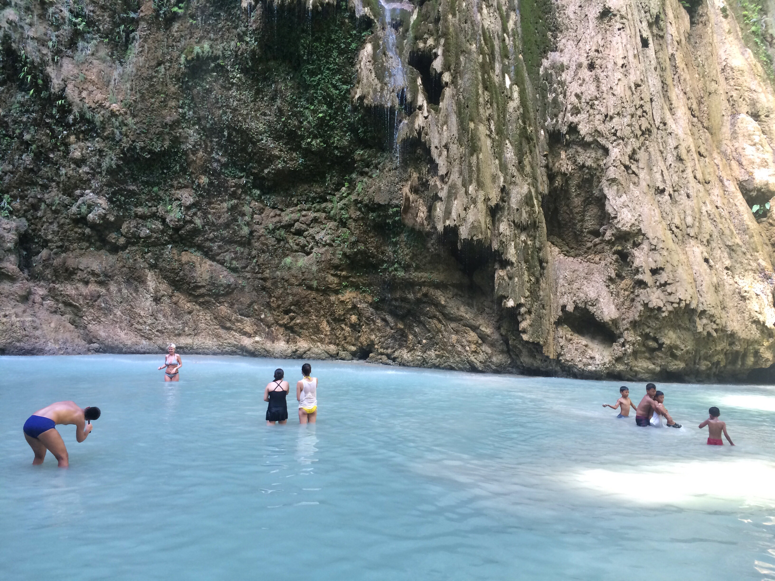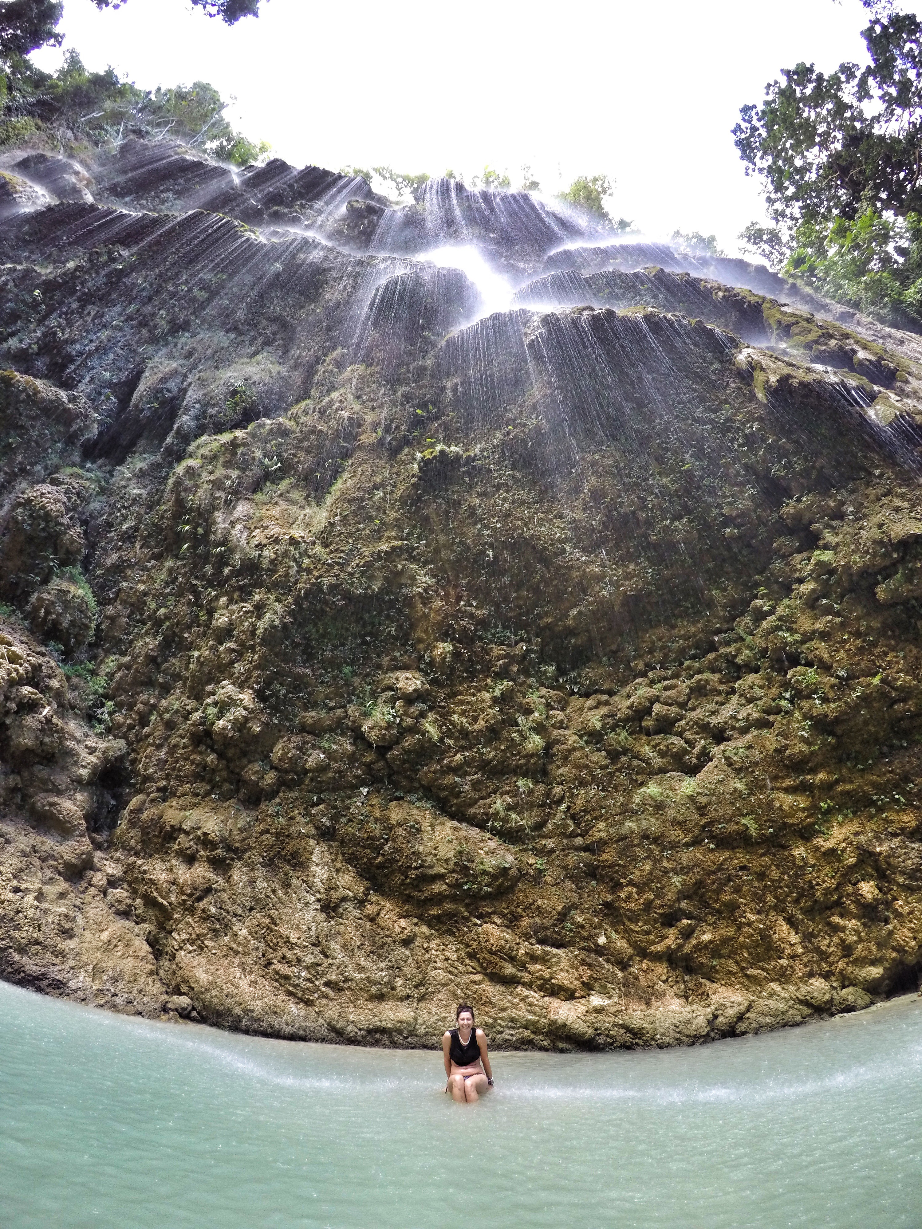 Later in the afternoon we visited Tumalog Waterfall which we rented Habal-habal drivers (men on motorbikes) to take us to. It was a cool drive along the beautiful coastline and then we headed steeply uphill into Cebu’s interior. The falls weren’t at their best as there wasn’t enough water but they were still beautiful and very unique compared to the average fall. A huge wall that was soft and must’ve been made from clay had water neatly trickling down in layers. The waterhole beneath was a milky bluey-grey colour but fairly shallow. I didn’t really fancy a swim so just went in with my top on and ended up tripping on a hidden rock and having an in-voluntary dip.