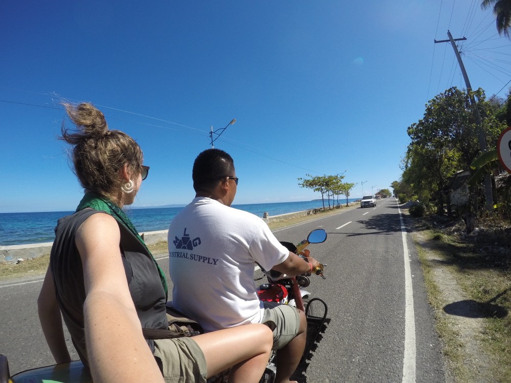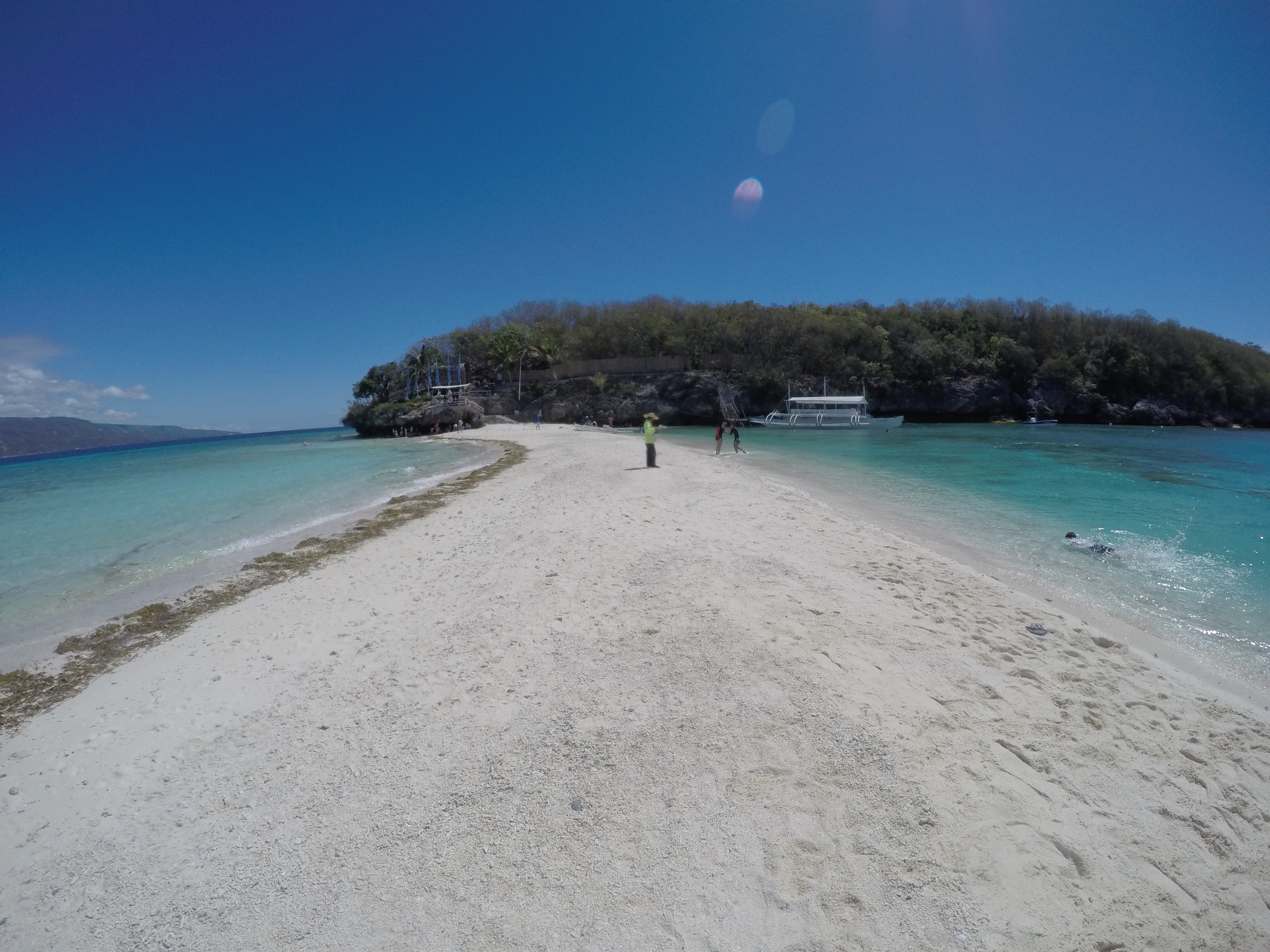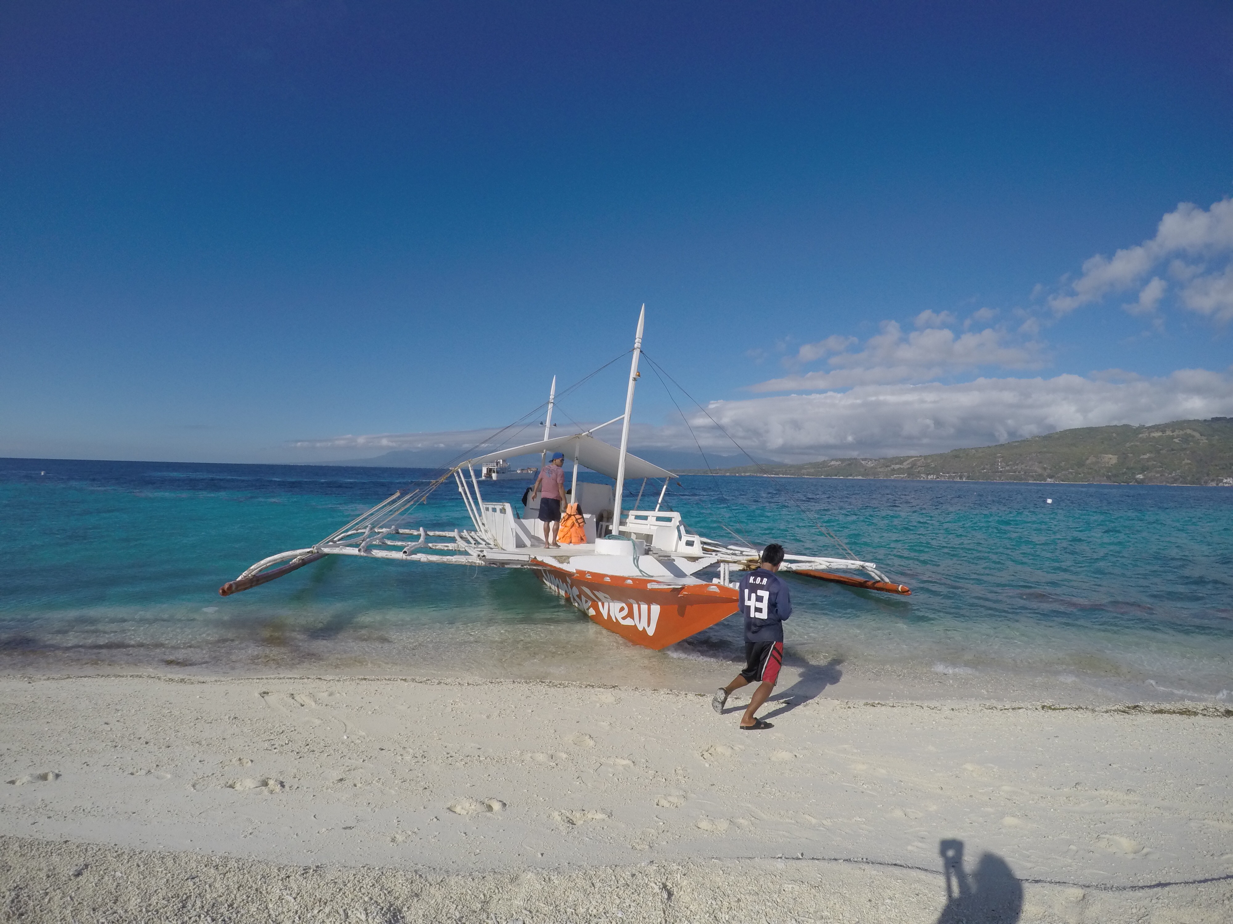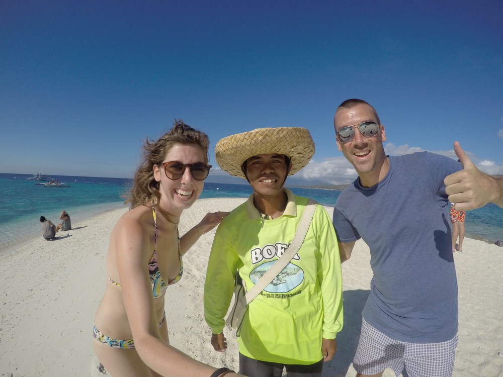We had a Filipino breakfast right after snorkelling with the whale sharks and then looked around for a boatmen to take us to Sumilon Island. We were quoted more than we wanted to pay so walked up the road only to find the resort quoting the same price…so we went back to our original spot hoping for more people to share the cost with and a local took pity on us and drove us for free in his trike because it was ‘Lord Sunday’. Lord Sunday didn’t work on the boat price though and we had to charter a huge boat all to ourselves for the 15 minute ride. It cost £20 for the boat and they dropped us off on the idyllic sandbar and would return at a time we arranged with them.