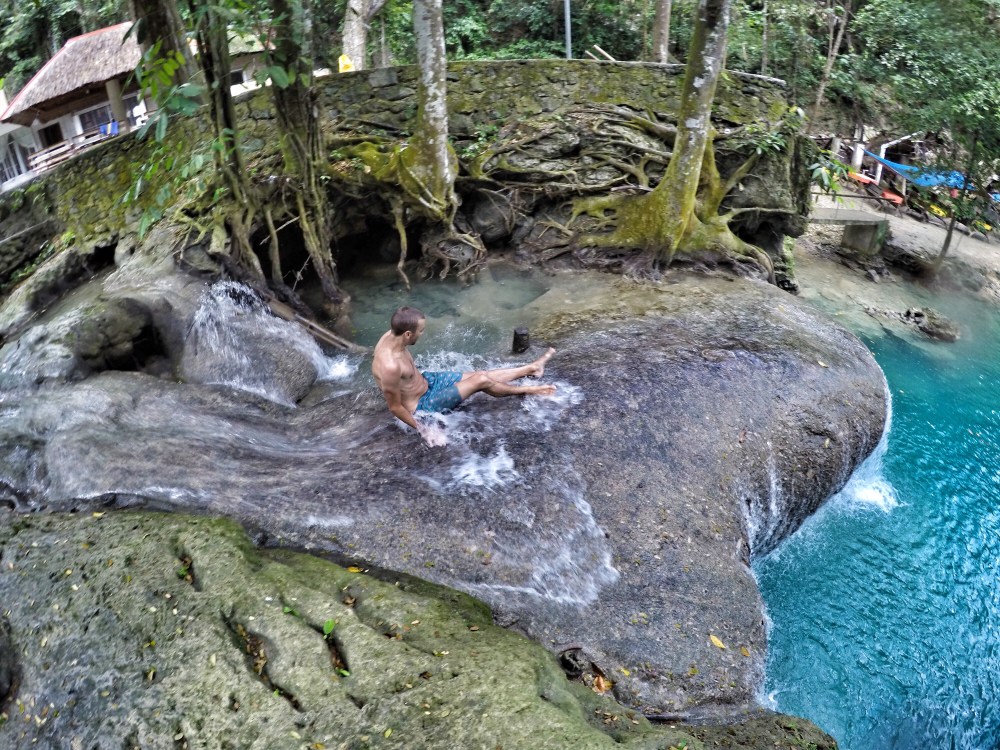 We finally got a glimpse of the main waterfall and hurried up our pace – it was stunning! The waterhole beneath the gushing fall was the bluest of blue colours. Locals offer bamboo rides across the water and under the falls so you can get a natural water massage. We used one of the platforms to jump into the water from…which was easier said than done as the bamboo was wet and extremely slippery. They had ropes tied to them so they could pull the rafts under the falls and on one jump I slipped with my foot going right under the rope and did a nasty belly flop – that was the end of that game!