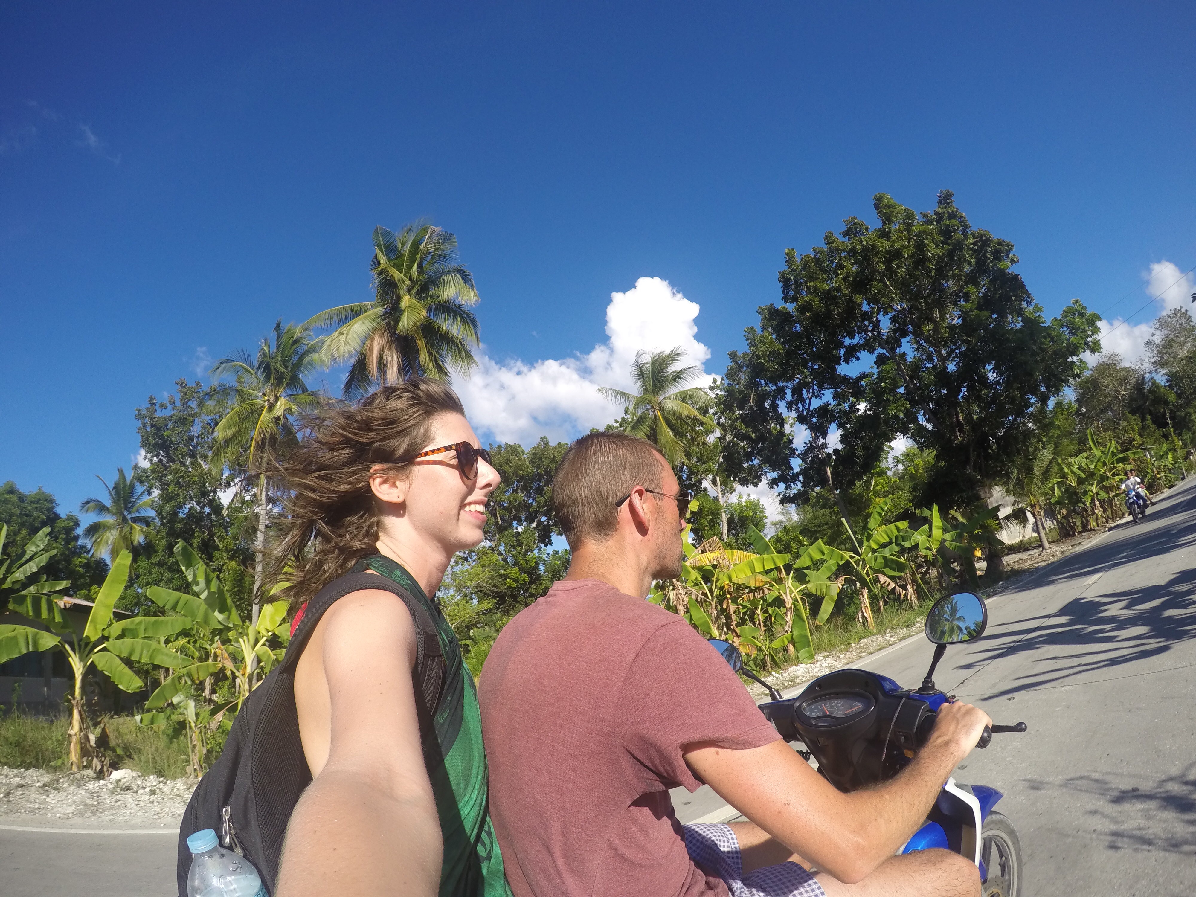 Panagsama Beach in Moalboal was much smaller and more chilled than we’d anticipated. A dirt track led close to the shore of a rocky beach and was lined with bars and restaurants. We hired out a motorbike to visit some sights in the area as it was cheaper to do this than get public transport.