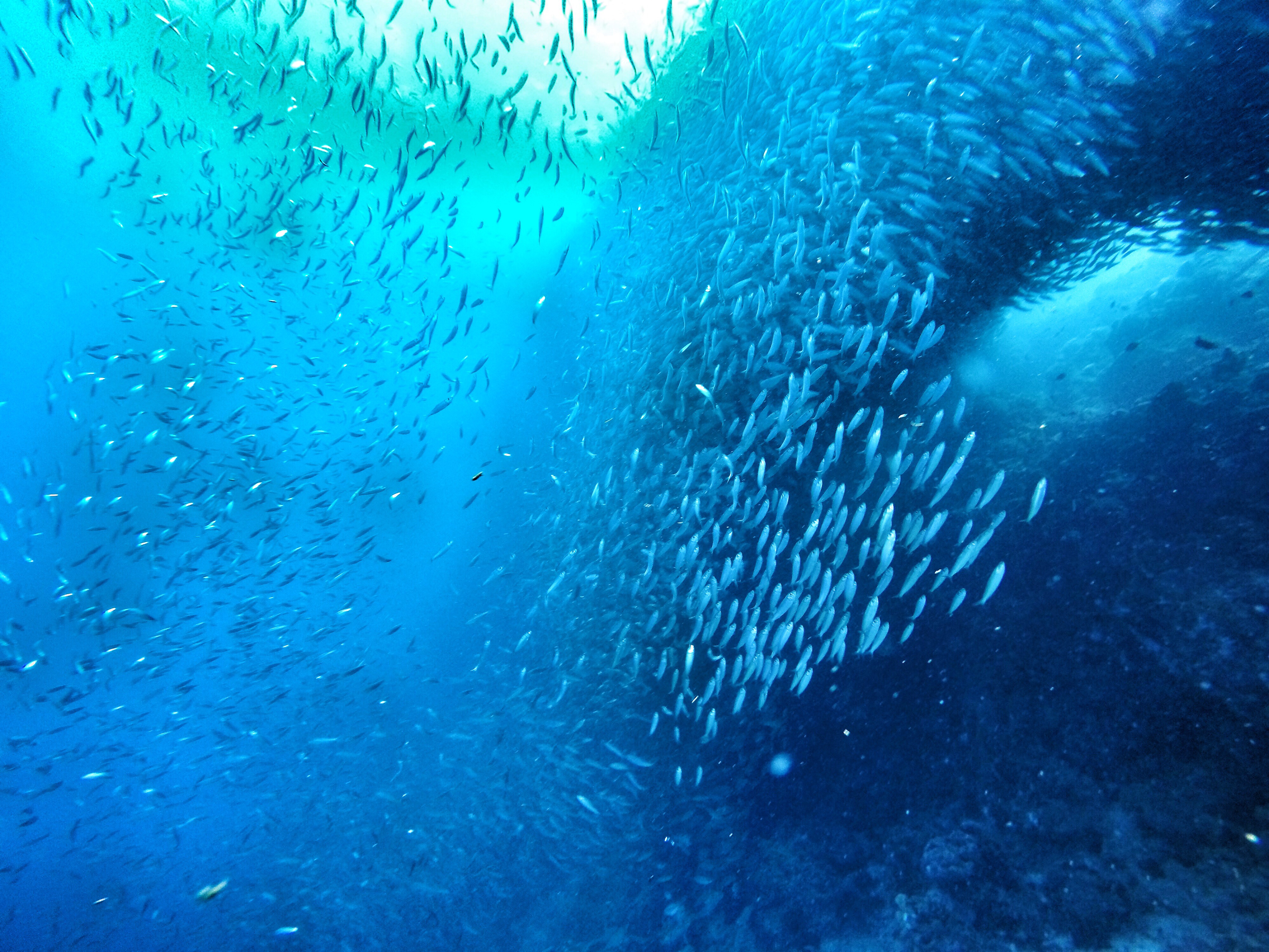 For the past few years the sardines that formally swam around Pescador Island have packed their suitcases and moved to the drop-off just 30m offshore from Panagsama Beach in Moalboal.