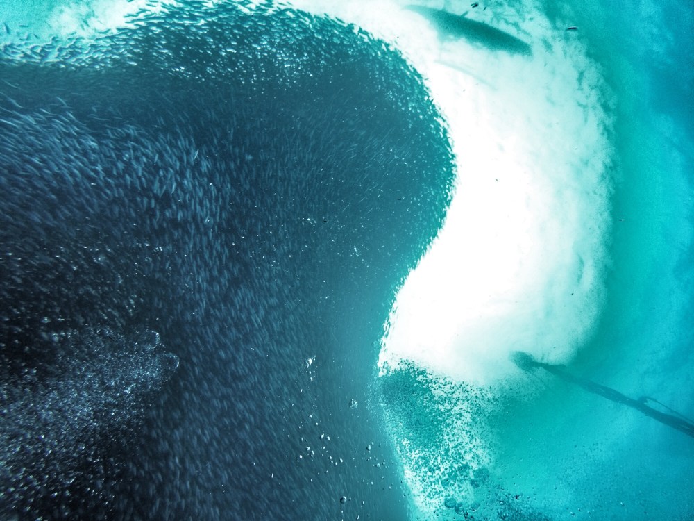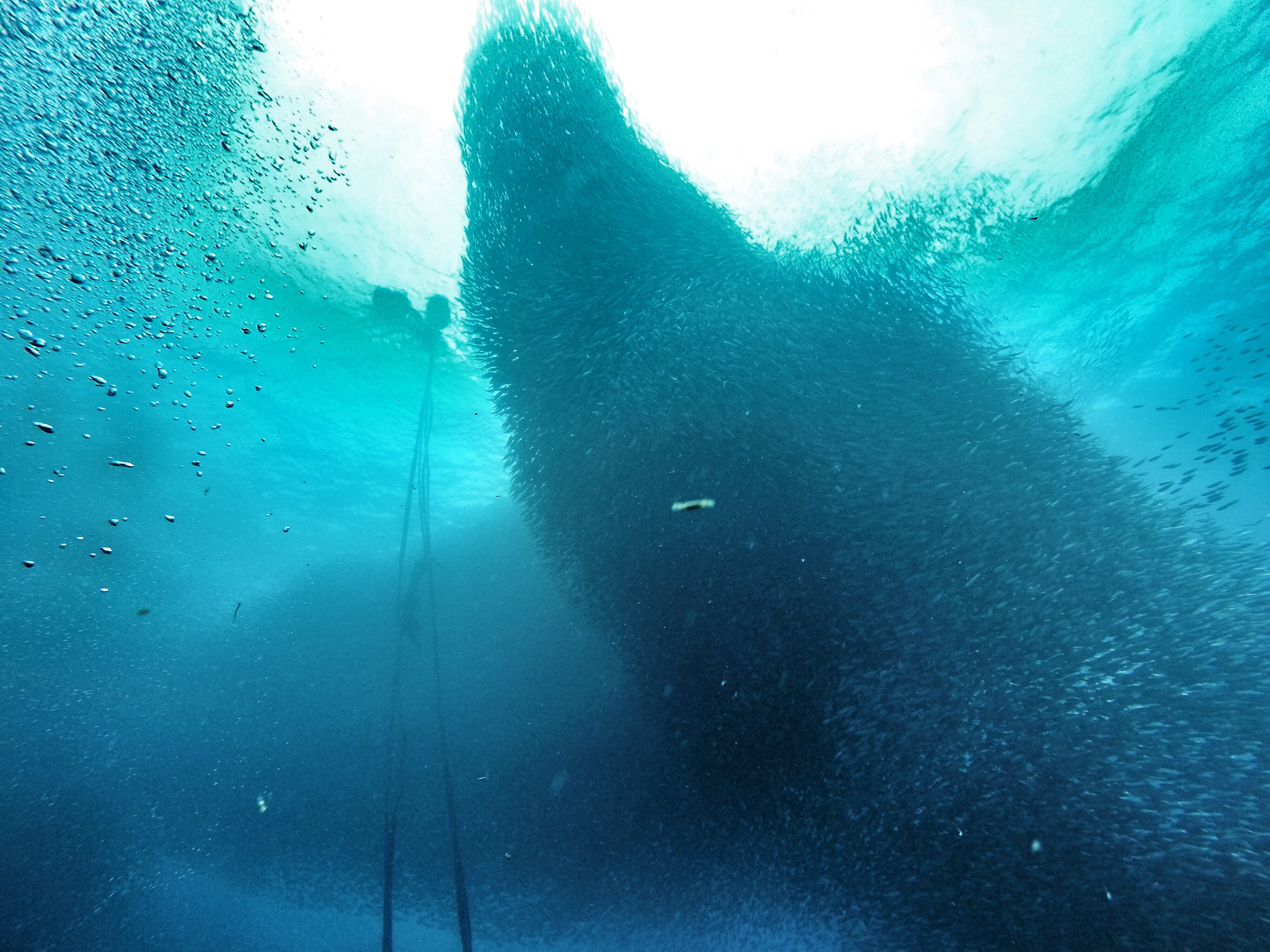 We went back the same way along the wall but at a different height and seemed to be even closer to the sardines here. The whole area in front of us was black from the congestion and as we swam towards them the thick shoal made a hole for us to go through. It was so dark inside that it felt like we were swimming through a cave. When we came out the other end I looked up and the patterns they were making were insane, it looked like an underwater tornado! It was so incredible. I think it’s one of my favourite dives I’ve ever done.