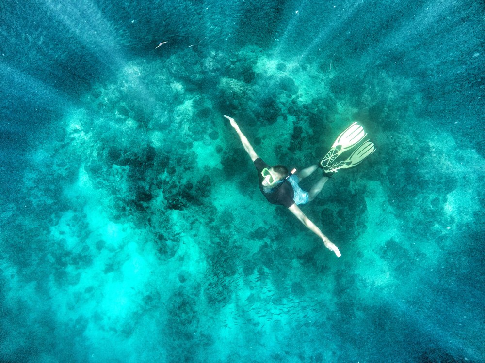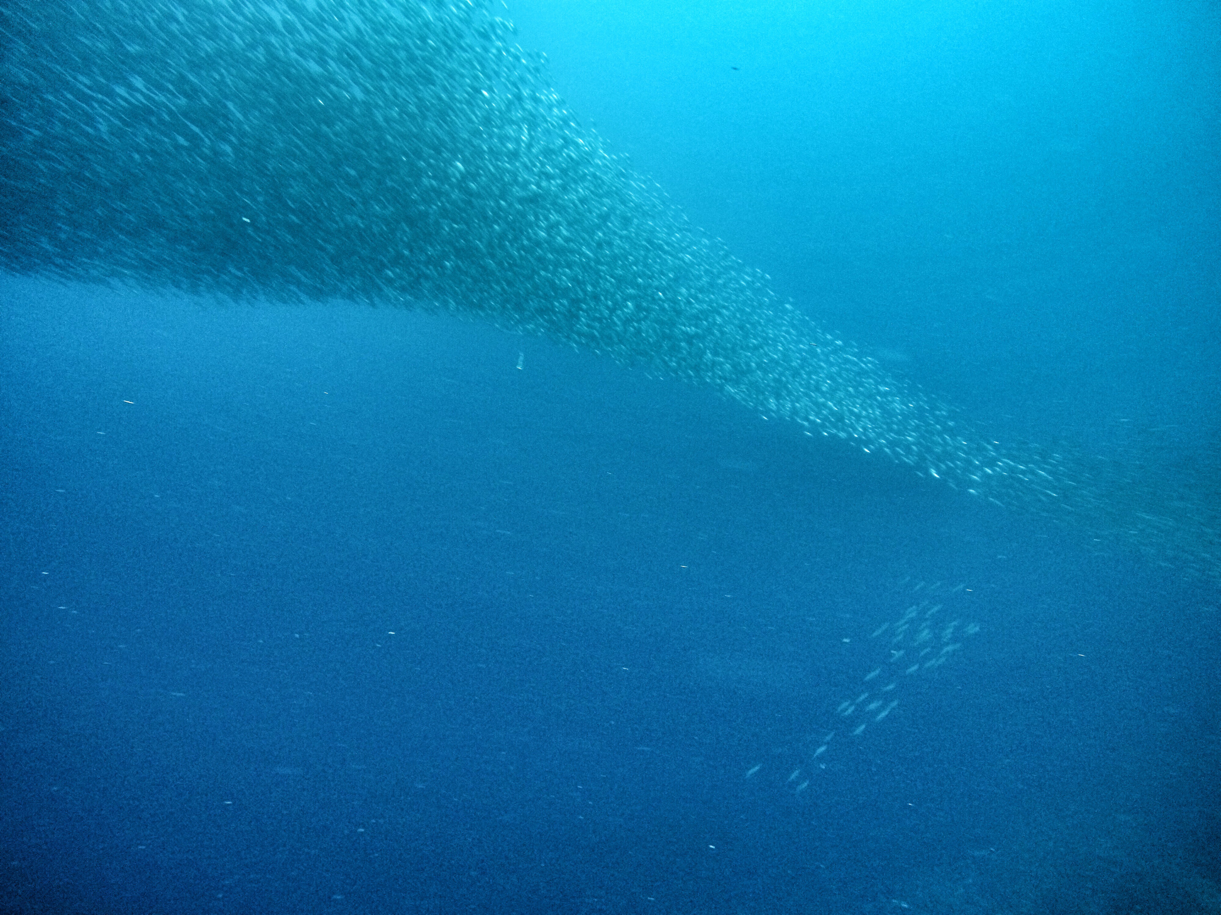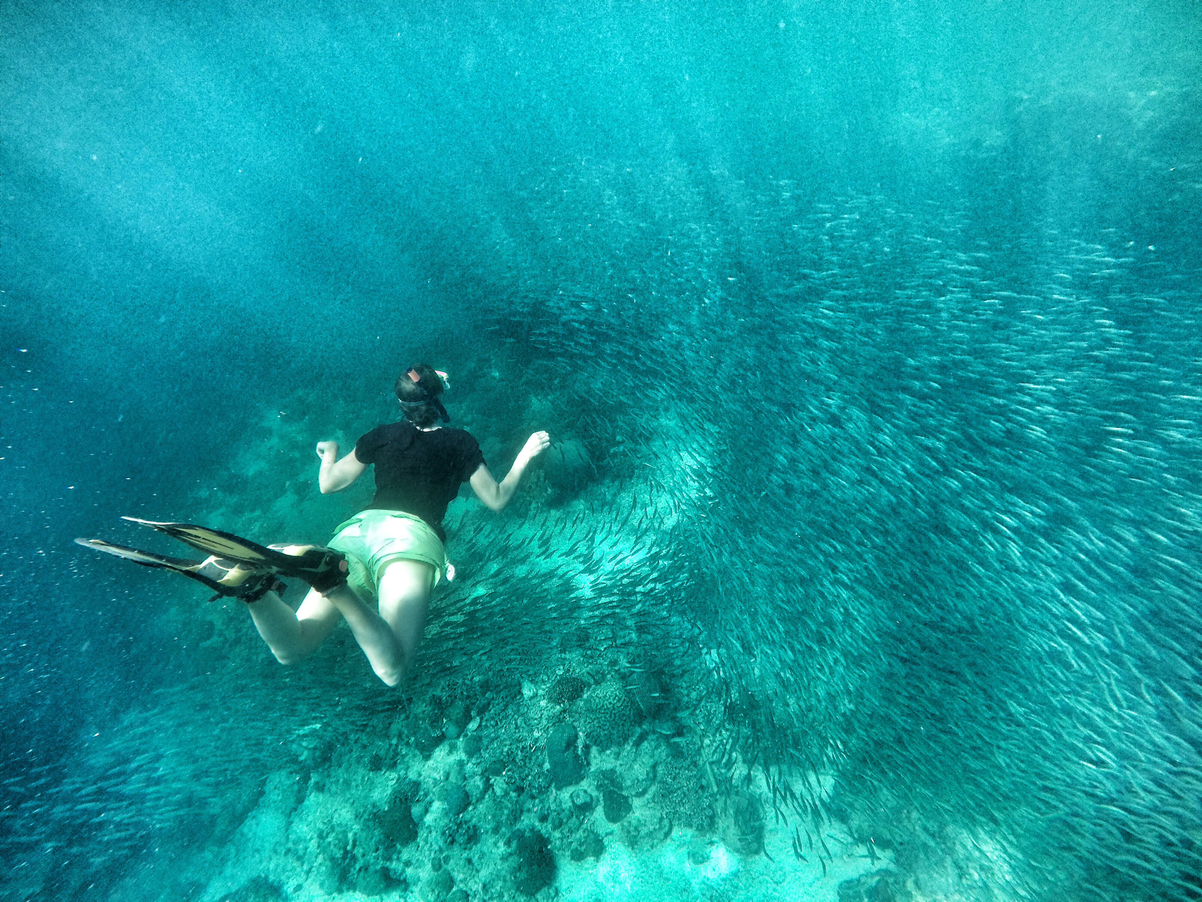 As the sardines are known to swim just a meter from the surface we decided to see them from a different vantage point and the dive shop kindly lent us snorkel gear for free. We had lots of fun diving down and watching them all disperse around us. Separate tight rows of them would glide at different paces through the water. And huge walls of them would appear beside us and shape-shift. Looking back at my photos I can see scary faces and cartoon images within the crowd of sardines, it’s just like in Finding Nemo!
