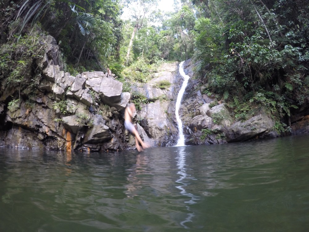 We haven’t don’t much walking let alone hiking in the Philippines, it’s just too hot, but we managed a late afternoon walk for about 4km each way to Pamuayan Falls. It was along such a dusty road and every step created a flume of dust around our ankles like we were setting off mini land mines. A 2 meter long snake slithered past us into the shrubbery and we soon left the dirt road and joined him in the jungle. The area was alive with insects and it was ear piercingly loud like a firealarm going off. The route through the jungle was a little hard to follow thanks to a fallen tree so we ended up hopping along the rocks in the river till we reached the falls. They weren’t spectacular by any stretch of the imagination but there was a pleasant water hole beneath which made for a refreshing cool off and Craig enjoyed jumping from the rock face. We even found a vine which we could swing on and fall into the waters which was fun.