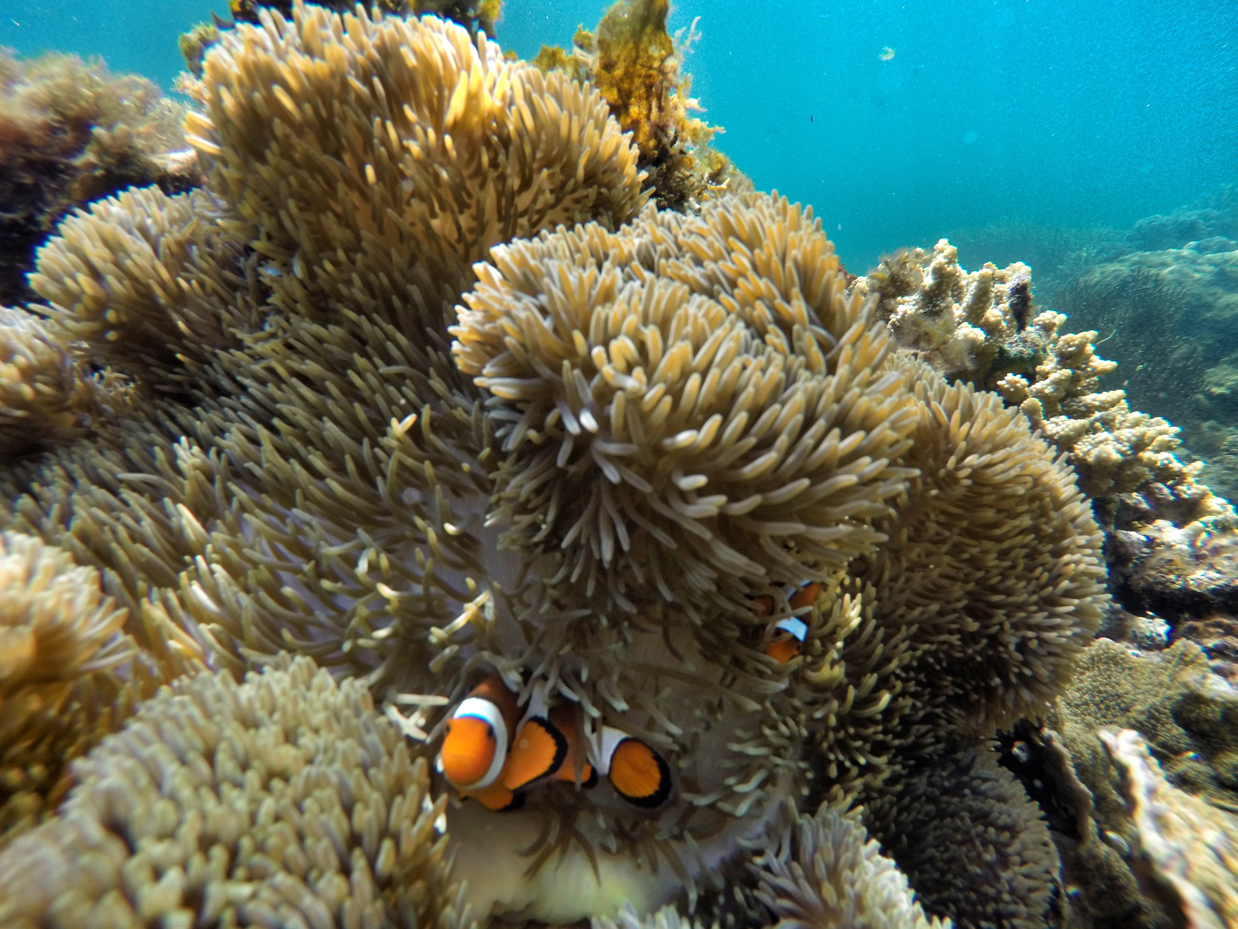 The next day we did an Island hopping trip which began with a couple of snorkel sites. There was lots of reef around but almost all of it was bleached. Such a shame as it was like an underground forest with lots of spikey hard corals, a few had green patches but the rest was dead. As for fish life we mostly saw jellyfish! Lots and lots of jellyfish, this meant we had to do lots of panicked reverse paddling to move away from them. We saw some perfect looking clown fish though with prominent white stripes across their bright orange bodies. They looked like grumpy prisoners unable to leave their swaying reef.