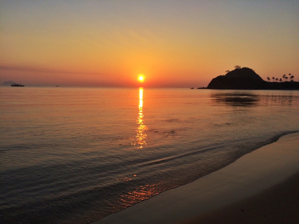 We had a wonderful day just swimming in the clear sea, sunbathing, reading, relaxing and eating. The sun set right in front of our room and it was so peaceful with just a few local fisherman around. We ate dinner at Mama Cherry’s a bubbly lady next door. At night her outside tables on the beach were surrounded by candles and flaming poles and we had a lovely long chat with her son and daughter in-law. Some local girls were selling Ice Candies which we’d seen but never tried and the family bought us one each to try which was sweet of them. You have to like tear a corner of the plastic off and suck the iced candy through the hole. I think we had a rather melted batch and they were already liquid. Craig tore his at the wrong end and the whole thing split and exploded over him. We all had the giggles after that…everyone except for Craig who was covered in sticky coconut juice.